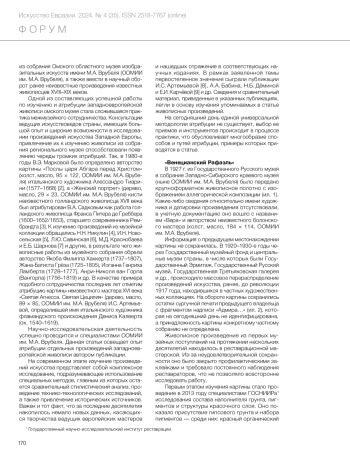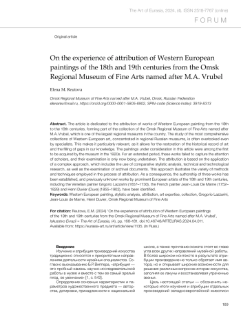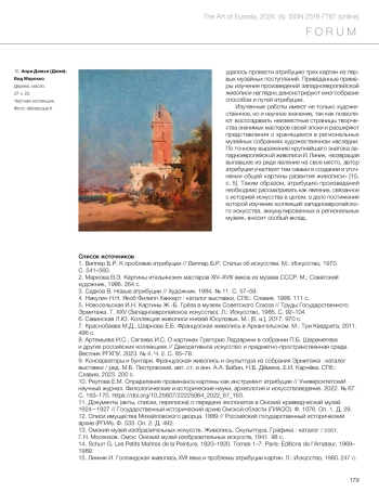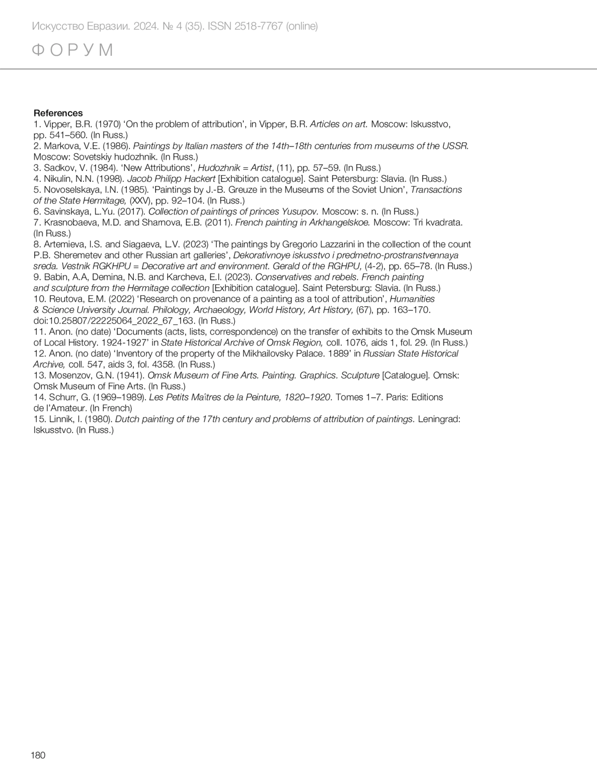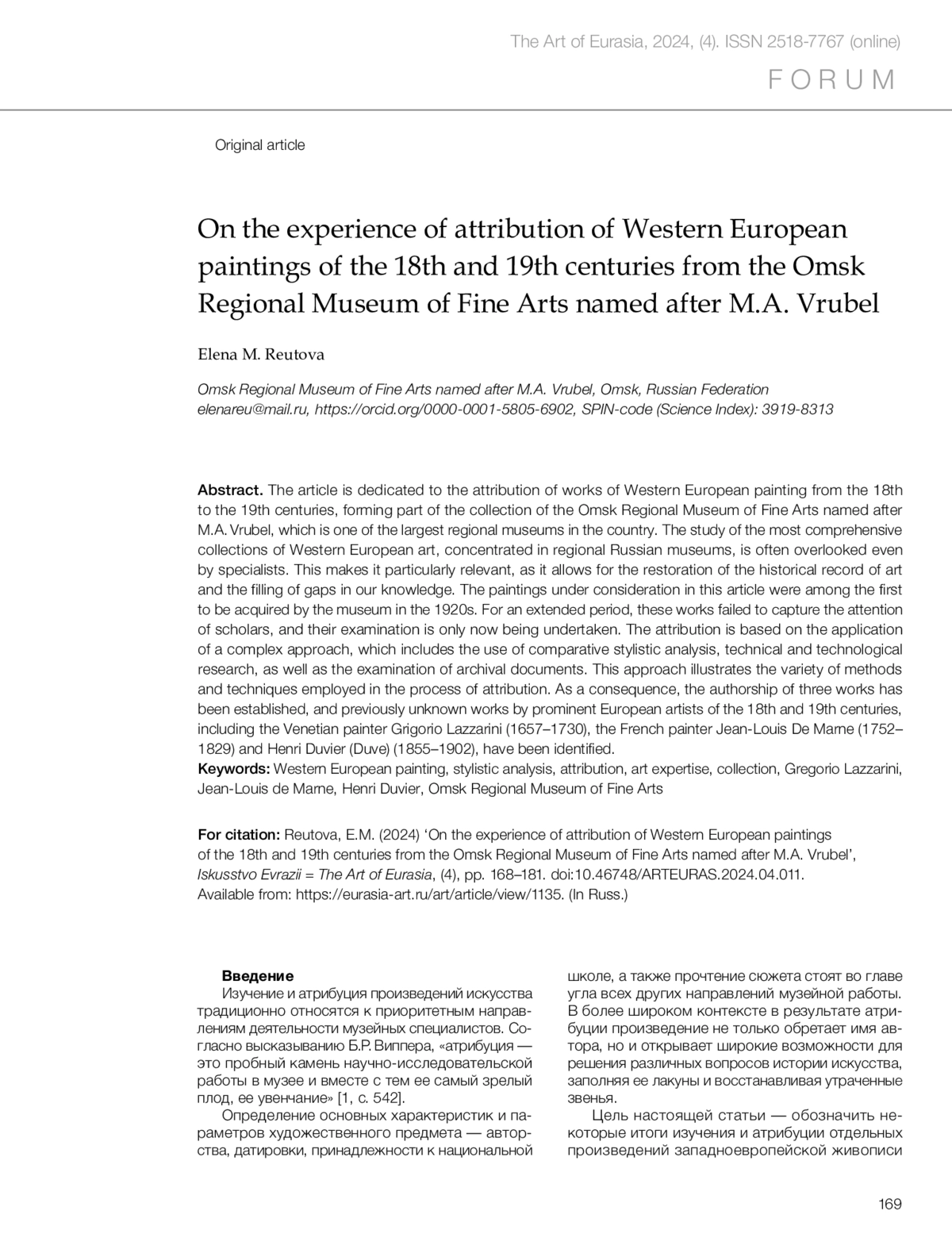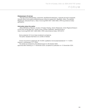 11. Reutova, E. M. Research on provenance of a painting as a tool of attribution / E. M. Reutova // Humanities & Science University Journal. Philology, Archaeology, World History, Art History. — 2022. — № 67. — P. 163–170. — DOI: 10.25807/22225064_2022_67_163. — (In Russ.).