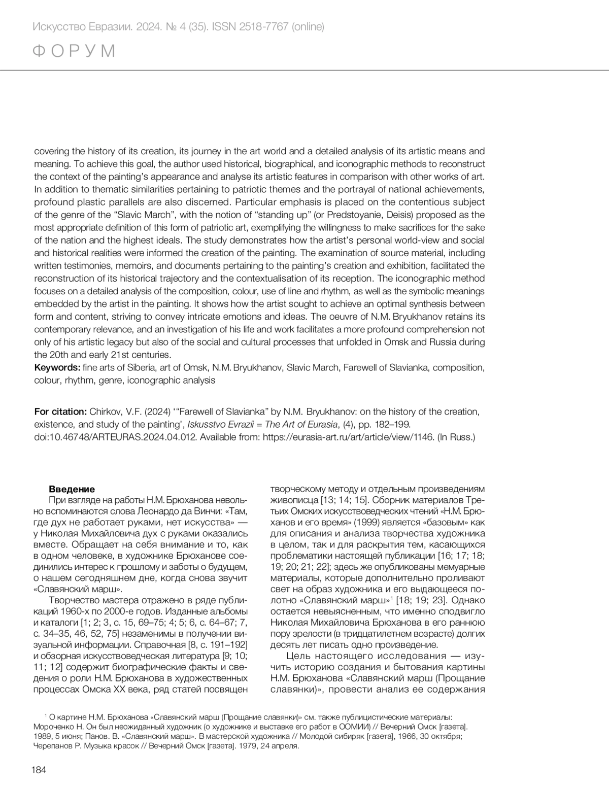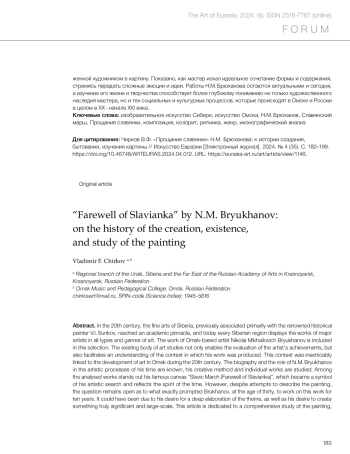 Чирков В.Ф. «Прощание славянки» Н.М. Брюханова: к истории создания, бытования, изучения картины // Искусство Евразии [Электронный журнал]. 2024. No 4 (35). С. 182–199.