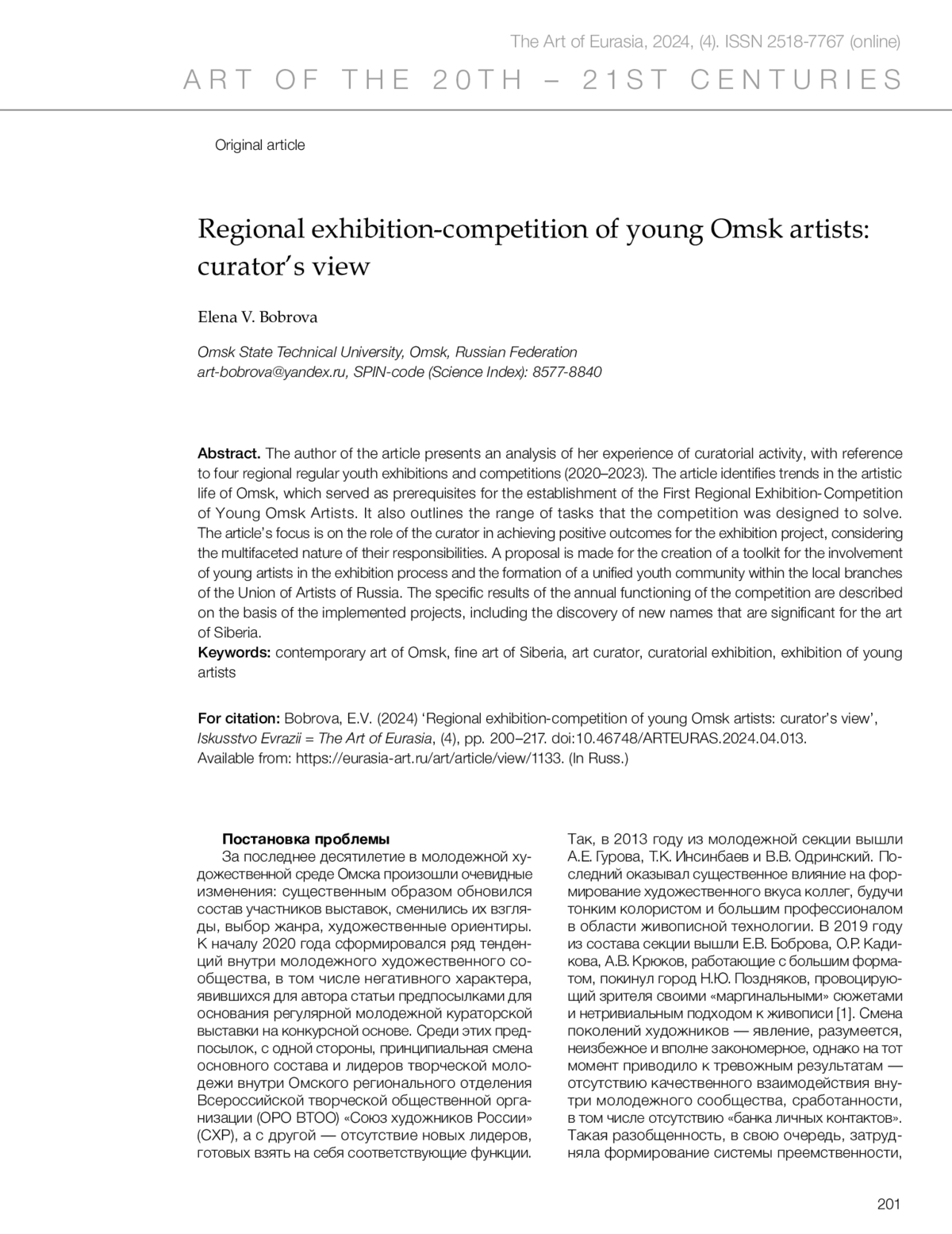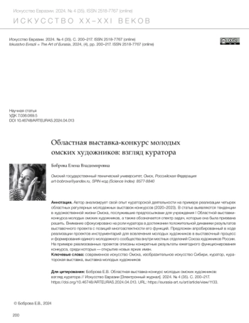 Боброва Е.В. Областная выставка-конкурс молодых омских художников: взгляд куратора // Искусство Евразии [Электронный журнал]. 2024. No 4 (35). С. 200–217.