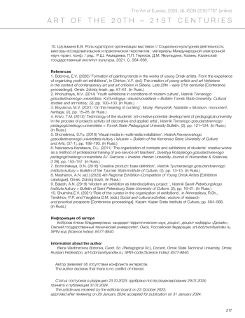1. Bobrova, E. V. Formation of painting trends in the works of young Omsk artists. From the experience of organizing youth art exhibitions / E. V. Bobrova // The creation of young artists and art historians in the context of contemporary art and art criticism in Siberia. Late 20th – early 21st centuries : conference proceedings / ed. by V. F. Chirkov. — Omsk : Zolotoj tirazh, 2020. — P. 57–61. — Text in Russ.