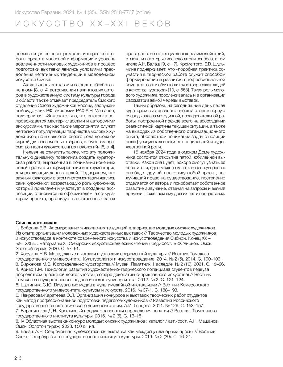 2. Balash, A. N. Modern art exhibition as interdisciplinary project / A. N. Balash // Bulletin of Saint Petersburg State University of Culture. — 2019. — № 2. — P. 16–21. — Text in Russ.