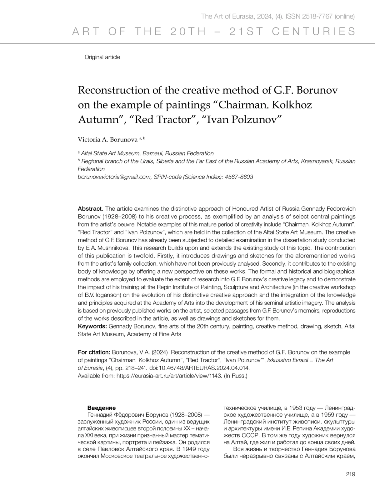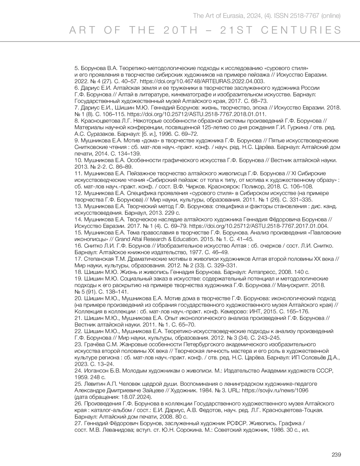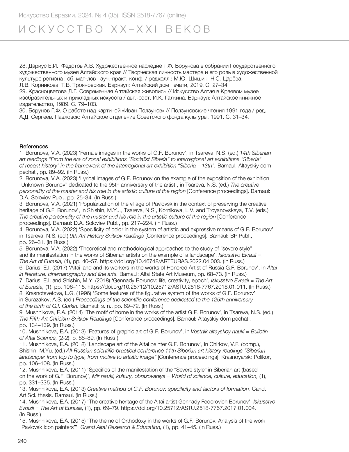 14. Mushnikova, E.A. (2017) ‘The creative heritage of the Altai artist Gennady Fedorovich Borunov’, *Iskusstvo Evrazii = The Art of Eurasia*, (1), pp. 69–79. https://doi.org/10.25712/ASTU.2518-7767.2017.01.004. (In Russ.)