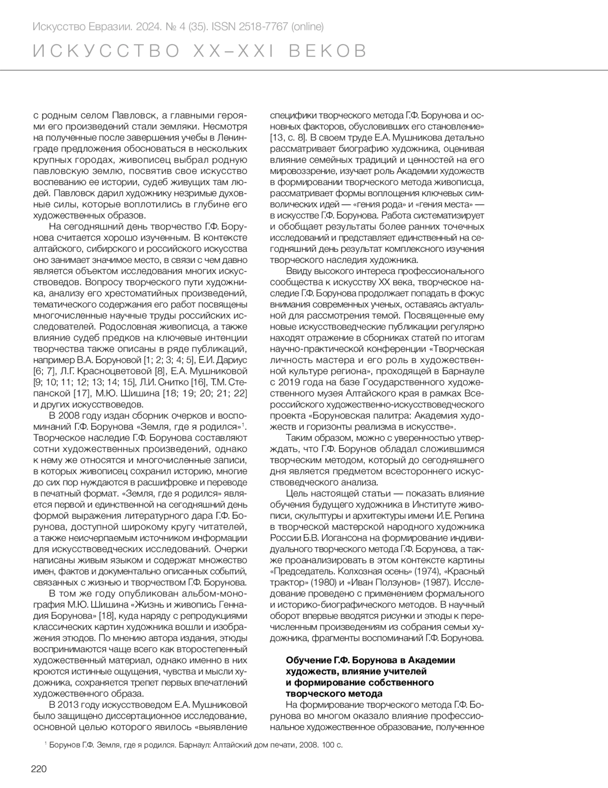 14. Мушникова Е.А. Творческое наследие алтайского художника Геннадия Фёдоровича Борунова // Искусство Евразии. 2017. № 1 (4). С. 69-79. DOI: 10.25712/ASTU.2518-7767.2017.01.004 EDN: UWQVSK