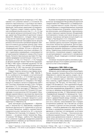 This article aims to address the work of Crimean artists of the twentieth century, determine the significance of N. S. Barsamov’s activity for the cultural life of Theodosia, and identify the artistic and content priorities of his students S. G. Mamchich, V. A. Sokolov, N. A. Shorin, and P. K. Stolyarenko in the early stages of their creative development. Furthermore, the work presents facts from the biography of N. S. Barsamov, which serve to illustrate the significance of his role as the director of the Theodosia Picture Gallery named after I. K. Aivazovsky and the founder of the painting school. The study’s artistic material comprised paintings from the Theodosia Picture Gallery named after I. K. Aivazovsky, and the Simferopol Art Museum. The articles published in specialised journals and art history collections, exhibition catalogues (all-union, republican, personal, individual art associations), memoirs and letters of the participants in the process were subjected to detailed analysis. A system-historical genre analysis enabled the construction of a genre chronotypology for the artists’ work. The formal and stylistic analysis was employed to examine individual works and identify common features. The comparative-analytical method facilitated the study of the formation of each representative of the considered painting direction and the identification of common trends and the influence of predecessors.
