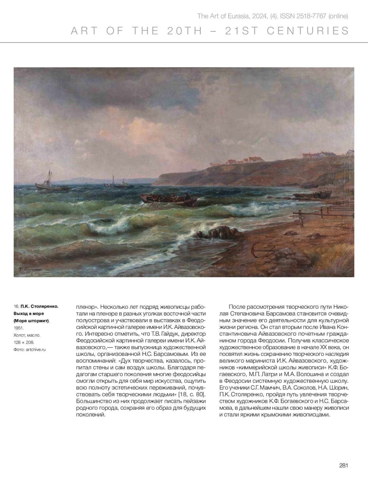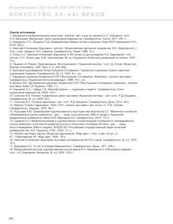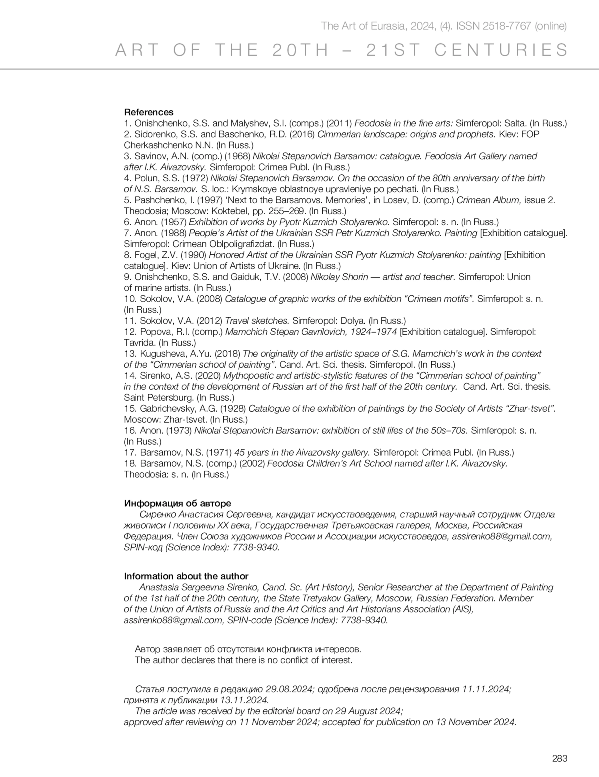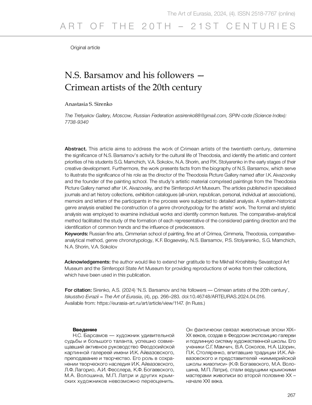 Сиренко А.С. Н.С. Барсамов и его ученики — крымские художники XX века // Искусство Евразии [Электронный журнал]. 2024. No 4 (35). С. 266–283. https://doi.org/10.46748/ARTEURAS.2024.04.016. URL: https://eurasia-art.ru/art/article/view/1147.