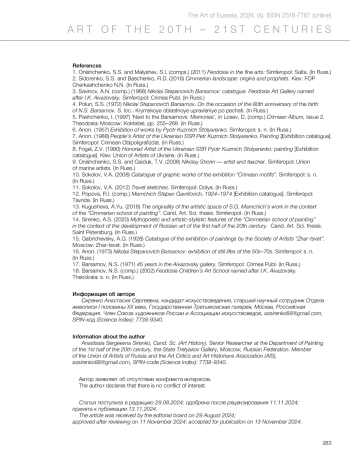 16. Sirenko, A. S. Mythopoetic and artistic‑stylistic features of the “Cimmerian school of painting” in the context of the development of Russian art of the first half of the 20th century. Cand. Art. Sci. thesis / A. S. Sirenko. — Saint Petersburg, 2020. — (In Russ.).