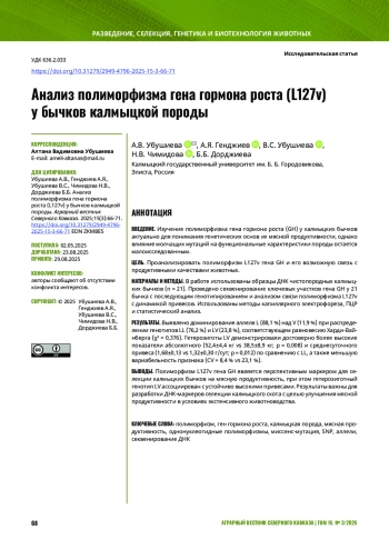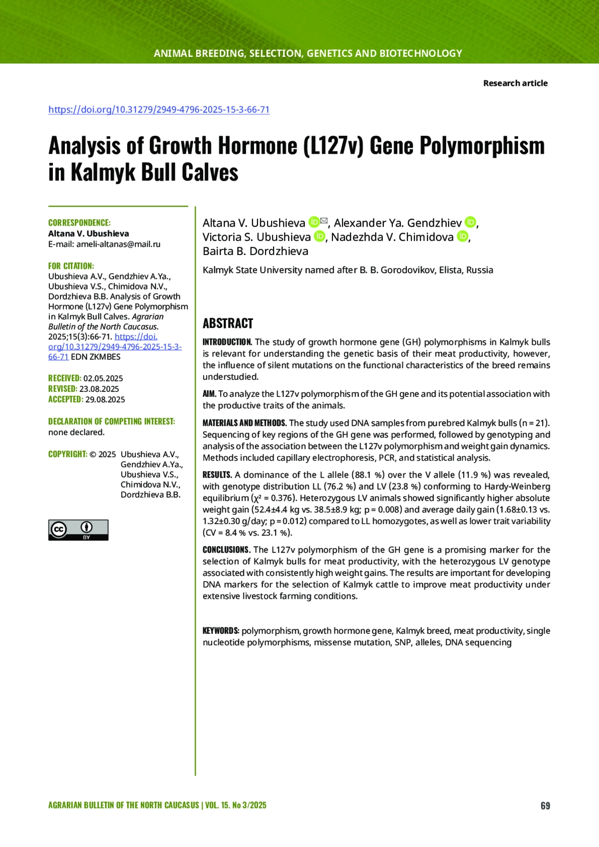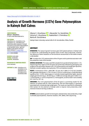 Chimidova N, Ubushieva A, Moiseikina L, Ubushieva V, Kalugina O, Kedeeva O. The Influence of Genetic Markers on the Productive Qualities of Young Kalmyk Breed. In: Zokirjon Ugli K.S, Muratov A, Ignateva S, editors. Fundamental and Applied Scientific Research in the Development of Agriculture in the Far East (AFE-2022). AFE 2023. Lecture Notes in Networks and Systems. 2024;733:401-409. DOI: 10.1007/978-3-031-37978-9_43