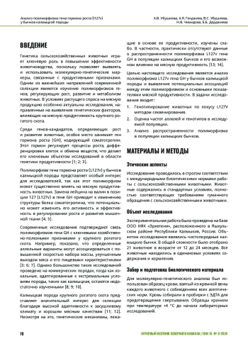 ВВЕДЕНИЕ. Изучение полиморфизма гена гормона роста (GH) у калмыцких бычков актуально для понимания генетических основ их мясной продуктивности, однако влияние молчащих мутаций на функциональные характеристики породы остается малоисследованным.