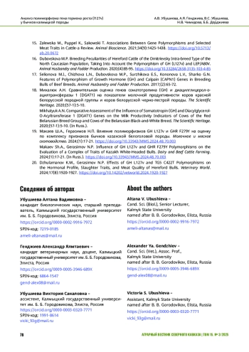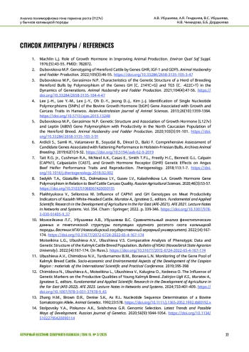 12. Chimidova N, Ubushieva A, Moiseikina L, Ubushieva V, Kalugina O, Kedeeva O. The Influence of Genetic Markers on the Productive Qualities of Young Kalmyk Breed. In: Zokirjon Ugli K.S, Muratov A, Ignateva S, editors. Fundamental and Applied Scientific Research in the Development of Agriculture in the Far East (AFE-2022). AFE 2023. Lecture Notes in Networks and Systems. 2024;733:401-409. DOI: 10.1007/978-3-031-37978-9_43