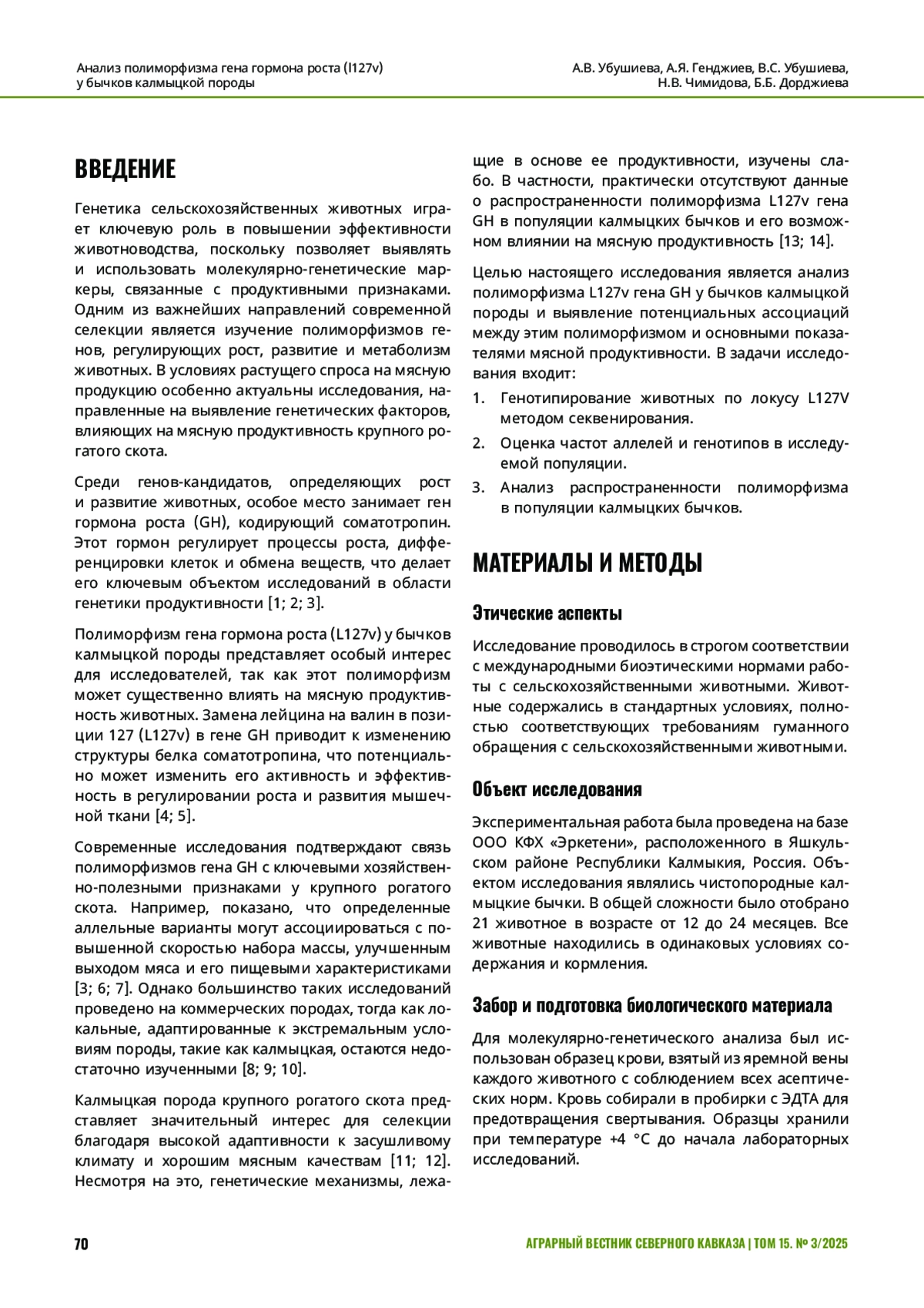 Генетика сельскохозяйственных животных играет ключевую роль в повышении эффективности животноводства, поскольку позволяет выявлять и использовать молекулярно-генетические маркеры, связанные с продуктивными признаками. Одним из важнейших направлений современной селекции является изучение полиморфизмов генов, регулирующих рост, развитие и метаболизм животных. В условиях растущего спроса на мясную продукцию особенно актуальны исследования, направленные на выявление генетических факторов, влияющих на мясную продуктивность крупного рогатого скота.