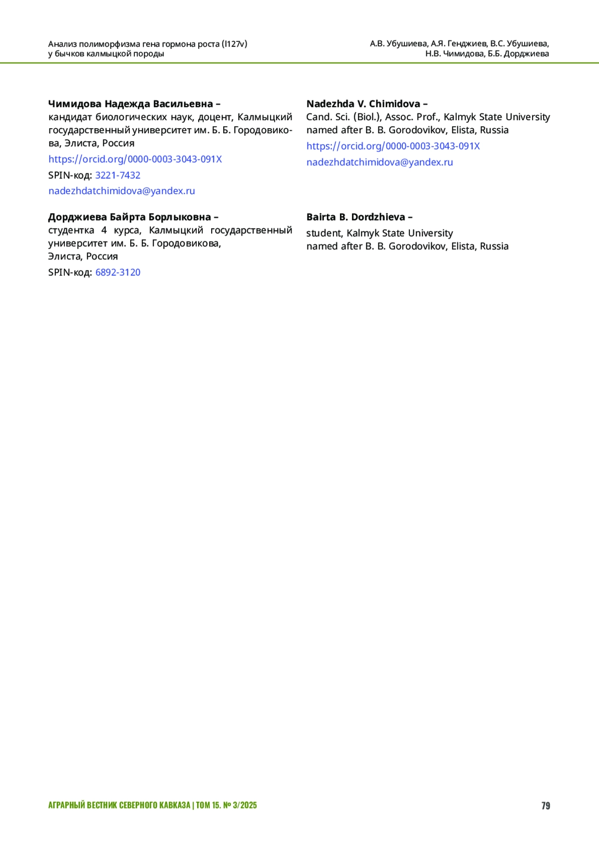 11. Ubushieva A.V., Chimidova N.V., Turdumamov B.M., Boraeva L.N. Monitoring of the Gene Pool of Kalmyk Breed Cattle. In: Socio-economic and Environmental Aspects of the Development of the Caspian Region. Materials of the International Scientific and Practical Conference. 2019;395-398.