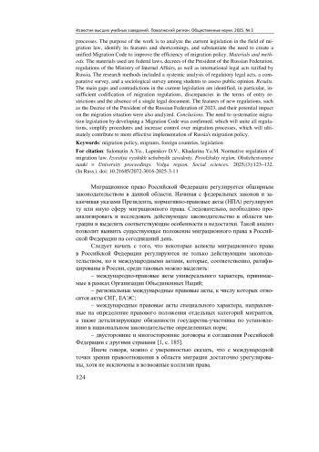 Выводы. Подтвердилась необходимость систематизации миграционного законодательства посредством разработки Миграционного кодекса, который объединит все нормативные акты, упростит процедуры и повысит контроль за миграционными процессами, что в конечном итоге будет способствовать более эффективной реализации миграционной политики России.