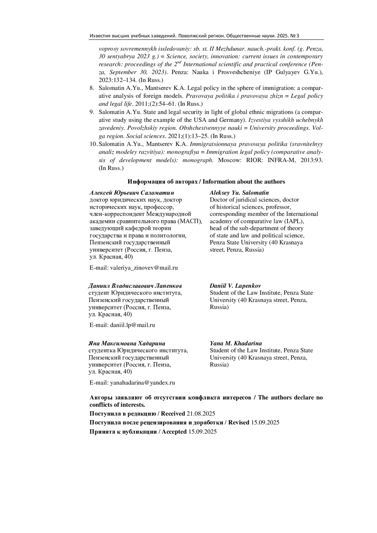 9. Саломатин А. Ю. Государственно-правовая безопасность в свете глобальных этнических миграций (сравнительное исследование на примере США и Германии) // Известия высших учебных заведений. Поволжский регион. Общественные науки. 2021. № 1 (57). С. 13-25. EDN: PIJGZX