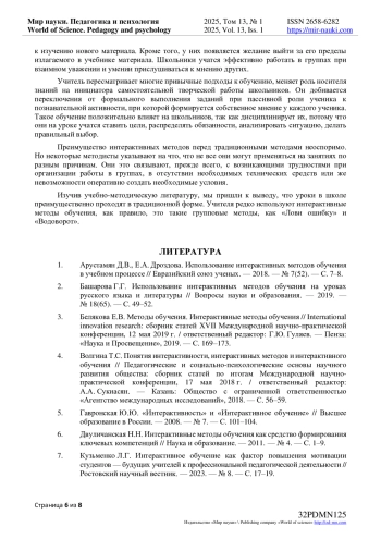 2. Башарова Г.Г. Использование интерактивных методов обучения на уроках русского языка и литературы // Вопросы науки и образования. - 2019. - № 18(65). - С. 49-52. EDN: HIEWDC