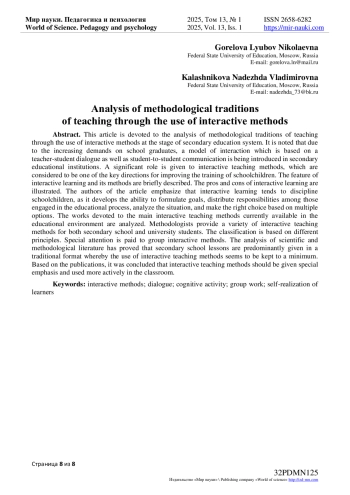 Данная статья посвящена анализу методических традиций обучения посредством применения интерактивных методов в системе среднего образования. Отмечается, что в связи с возрастающими требованиями к выпускнику школы в средних образовательных учреждениях внедряется такая модель взаимодействия, которая основывается на диалоге учителя с учениками и учеников друг с другом. Значительная роль отводится интерактивным методам обучения, которые, как известно, являются одним из главных направлений совершенствования подготовки школьников. Кратко характеризуется особенность интерактивного обучения и его методы. Показаны преимущества и слабые стороны интерактивного обучения. Авторы статьи акцентируют внимание на то, что интерактивное обучение дисциплинирует школьников, так как развивает умение формулировать цели, распределять обязанности между участниками учебного процесса, анализировать ситуацию, делать правильный выбор из разных вариантов. Анализируются работы, посвященные основным современным интерактивным методам обучения. Методисты предлагают разнообразные интерактивные методы обучения как для учащихся средних общеобразовательных учреждений, так и для студентов вузов. В основу классификации положены разные принципы. Уделено внимание групповым интерактивным методам. Проведенный анализ научно-методической литературы показал, что уроки в средней общеобразовательной школе преимущественно проходят в традиционной форме, учителя редко используют интерактивные методы обучения. На основе публикаций был сделан вывод о необходимости более активного использования на занятиях интерактивных методов обучения.