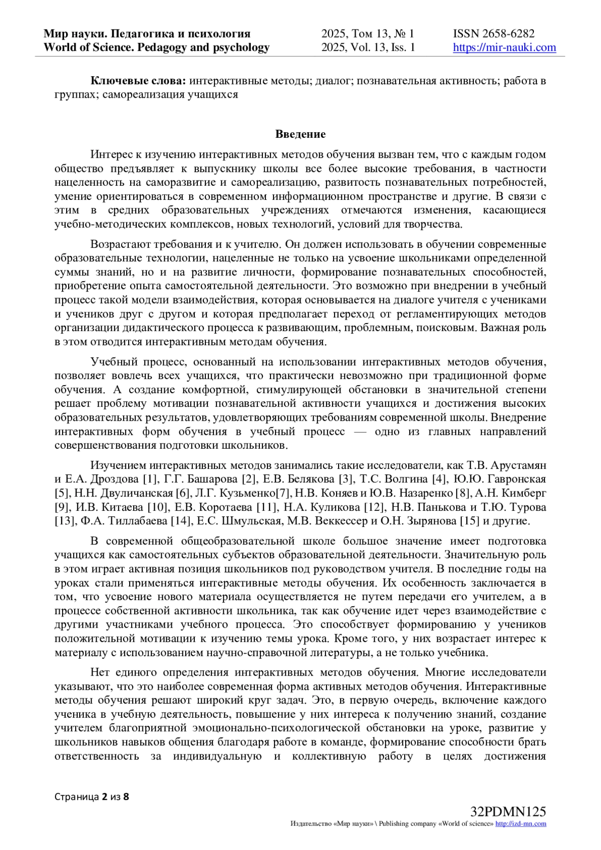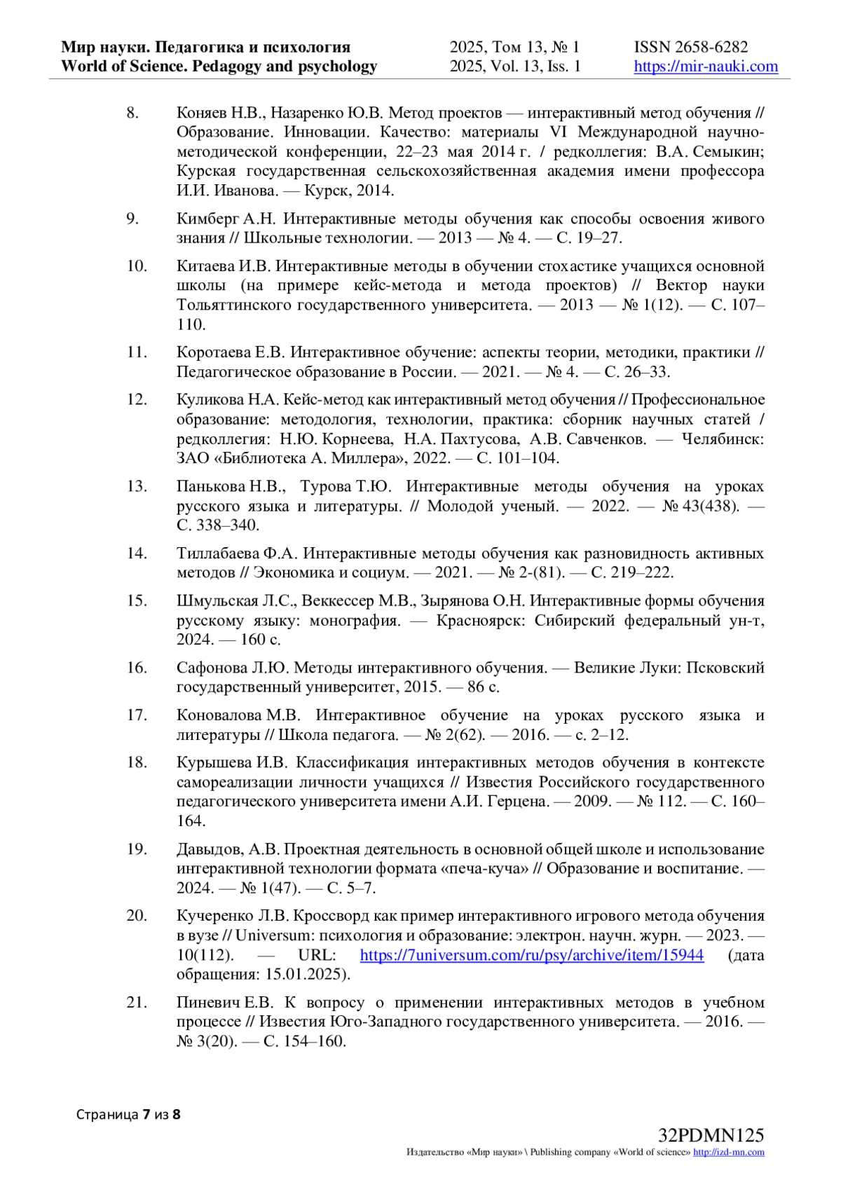 14. Тиллабаева Ф.А. Интерактивные методы обучения как разновидность активных методов // Экономика и социум. - 2021. - № 2-(81). - С. 219-222. EDN: DGDETU