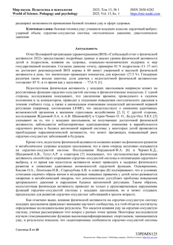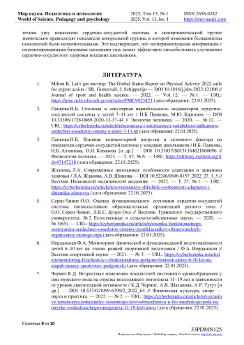 7. Чермит К.Д. Возрастные изменения показателей системного кровообращения у лиц мужского пола на отрезке восходящего онтогенеза 11-19 лет в зависимости от уровня двигательной активности / К.Д. Чермит, А.В. Шаханова, А.Р. Тугуз [и др.] // Физическая культура, спорт - наука и практика. - 2022. - № 2. - URL: https://cyberleninka.ru/article/n/vozrastnye-izmeneniya-pokazateley-sistemnogo-krovoobrascheniya-u-lits-muzhskogo-pola-na-otrezke-voshodyaschego-ontogeneza-11-19-let/viewer (дата обращения: 22.01.2025). DOI: 10.53742/1999-6799/2_2022_64 EDN: LDPUPE