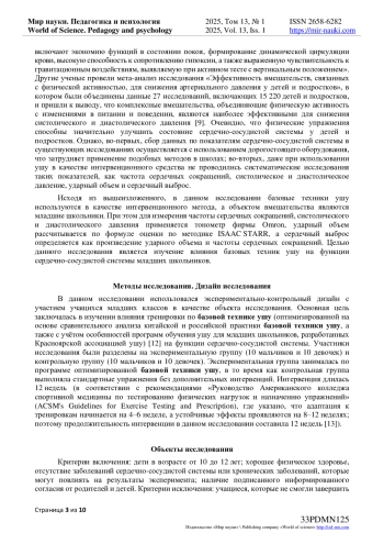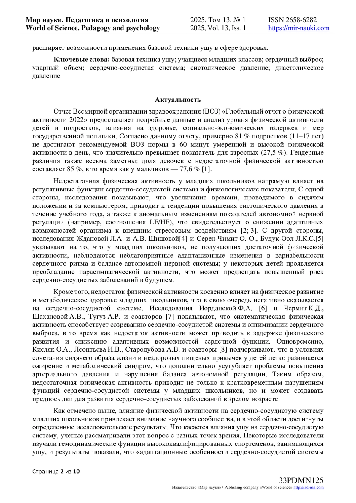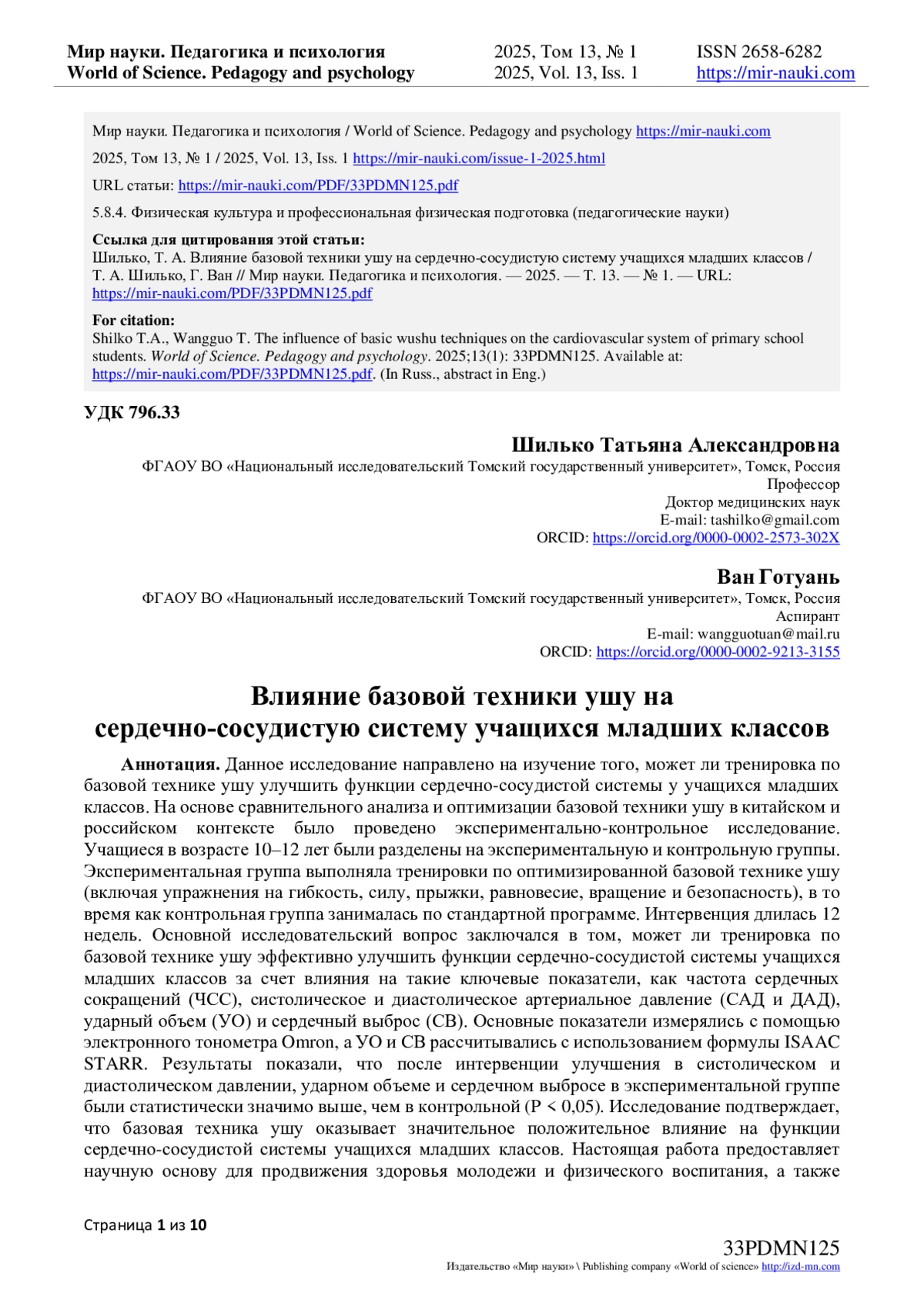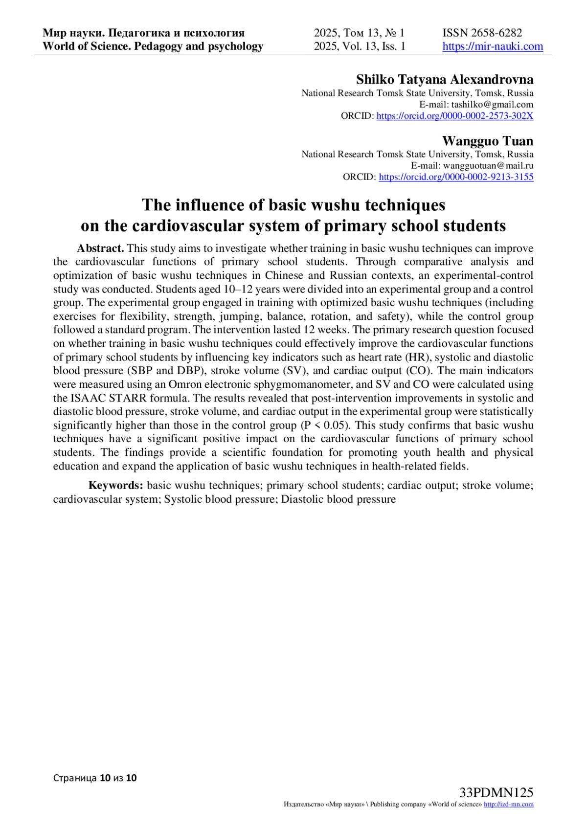 Данное исследование направлено на изучение того, может ли тренировка по базовой технике ушу улучшить функции сердечно-сосудистой системы у учащихся младших классов. На основе сравнительного анализа и оптимизации базовой техники ушу в китайском и российском контексте было проведено экспериментально-контрольное исследование. Учащиеся в возрасте 10-12 лет были разделены на экспериментальную и контрольную группы. Экспериментальная группа выполняла тренировки по оптимизированной базовой технике ушу (включая упражнения на гибкость, силу, прыжки, равновесие, вращение и безопасность), в то время как контрольная группа занималась по стандартной программе. Интервенция длилась 12 недель. Основной исследовательский вопрос заключался в том, может ли тренировка по базовой технике ушу эффективно улучшить функции сердечно-сосудистой системы учащихся младших классов за счет влияния на такие ключевые показатели, как частота сердечных сокращений (ЧСС), систолическое и диастолическое артериальное давление (САД и ДАД), ударный объем (УО) и сердечный выброс (СВ). Основные показатели измерялись с помощью электронного тонометра Omron, а УО и СВ рассчитывались с использованием формулы ISAAC STARR. Результаты показали, что после интервенции улучшения в систолическом и диастолическом давлении, ударном объеме и сердечном выбросе в экспериментальной группе были статистически значимо выше, чем в контрольной (P < 0,05). Исследование подтверждает, что базовая техника ушу оказывает значительное положительное влияние на функции сердечно-сосудистой системы учащихся младших классов. Настоящая работа предоставляет научную основу для продвижения здоровья молодежи и физического воспитания, а также расширяет возможности применения базовой техники ушу в сфере здоровья.