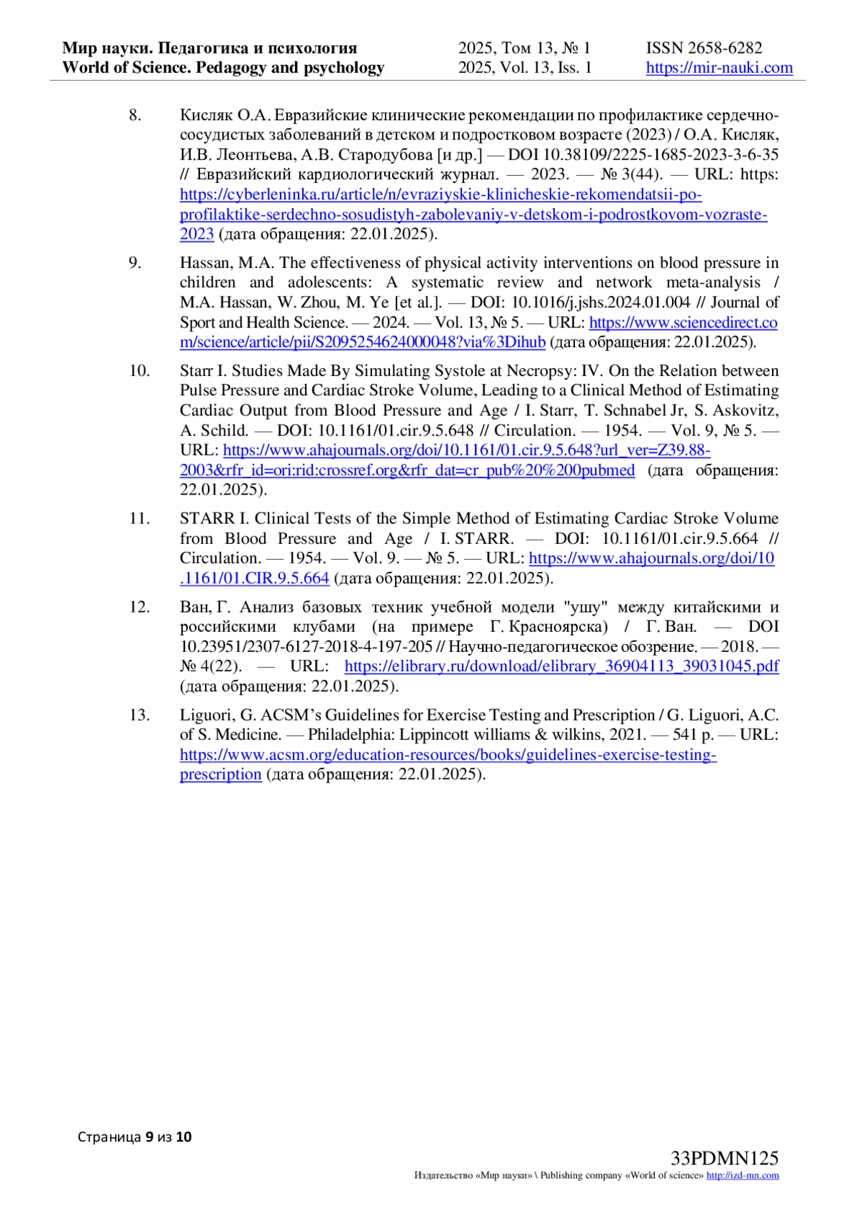 9. Hassan, M.A. The effectiveness of physical activity interventions on blood pressure in children and adolescents: A systematic review and network meta-analysis / M.A. Hassan, W. Zhou, M. Ye [et al.]. - // Journal of Sport and Health Science. - 2024. - Vol. 13, № 5. - URL: https://www.sciencedirect.com/science/article/pii/S2095254624000048?via%3Dihub (дата обращения: 22.01.2025). DOI: 10.1016/j.jshs.2024.01.004 EDN: WHBOMV
