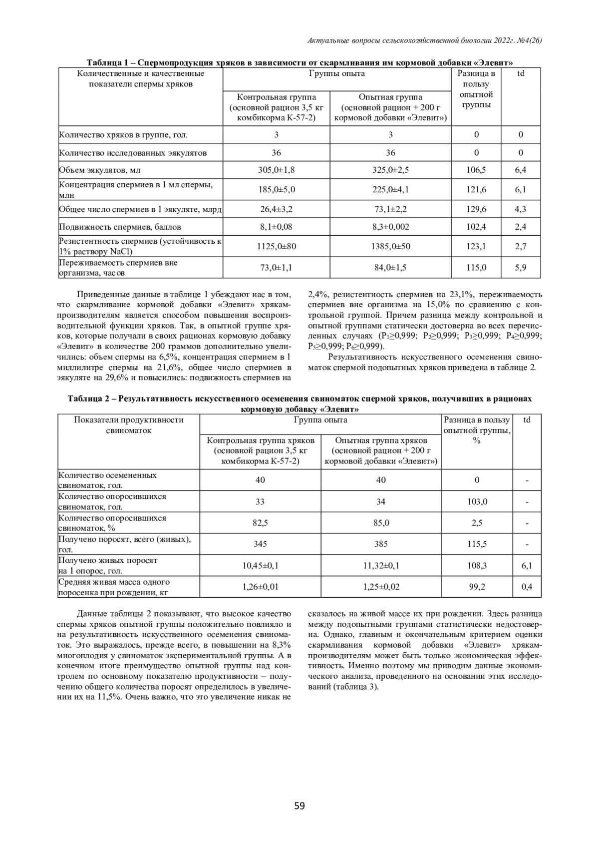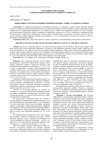 На основании проведенных исследований выяснено, что введение в рацион хряков кормовой добавки «Элевит» в количестве 200 граммов дополнительно способствует увеличению количественных показателей спермы: объема спермы на 6,5%, концентрации спермиев в 1 мл. спермы на 21,6%, общего числа спермиев эякулятах на 29,6% и повышению качественных показателей спермы: подвижности спермиев вне организма на 15,0% по сравнению с контрольной группой. Кроме того, у свиноматок, осемененных спермой хряков опытной группы, многоплодие повысилось на 8,3%, что позволило увеличить общее количество поросят при рождении на 11,5%, а себестоимость их при этом снизить на 10,4% по сравнению с контрольной группой.