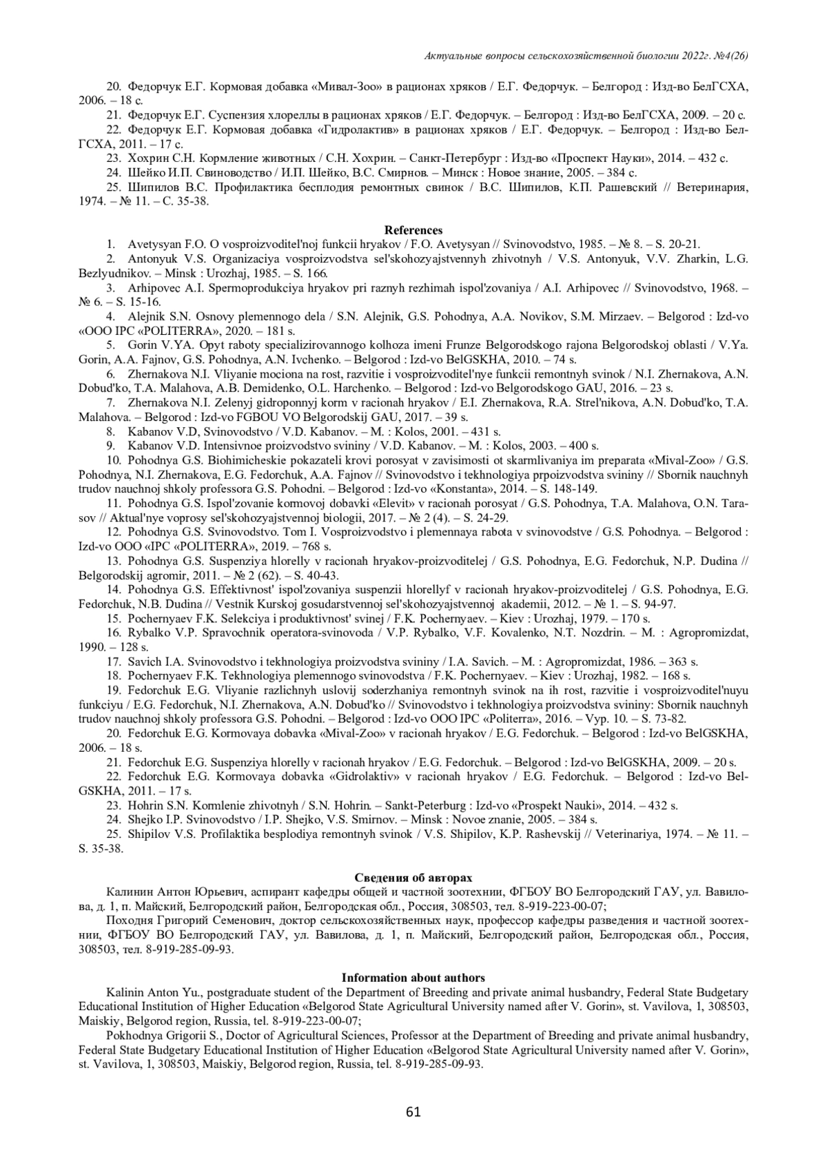 1. Аветисян Ф. О. О репродуктивной функции хряков / Ф. О. Аветисян // Свиноводство, 1985. - № 8. - С. 20-21. 2. Антонюк В. С. Организация воспроизводства сельскохозяйственных животных / В. С. Антонюк, В. В. Жаркин, Л. Г. Безлюдников. - Минск: Урожай, 1985. - С. 166. 3. Архиповец А. И. Спермопродукция хряков при разных режимах использования / А. И. Архиповец // Свиноводство, 1968. - № 6. - С. 15-16. 4. Алейник С. Н. Основы племенного дела / С. Н. Алейник, Г. С. Походня, А. А. Новиков, С. М. Мирзаев. - Белгород: Изд-во “ООО ИПЦ “ПОЛИТЕРРА”, 2020. - 181 с. EDN: CZVRWT 5. Горин В. Я. Опыт работы специализированного колхоза имени Фрунзе Белгородского района Белгородской области / В. Я. Горин, А. А. Файнов, Г. С. Походня, А. Н. Ивченко. - Белгород: Изд-во БелГСХА, 2010. - 74 с. EDN: YTLCKT 6. Жернакова Н. И. Контроль движения на рост, развитие и воспроизводительные функции ремонтных свинок / Н. И. Жернакова, А. Н. Добудько, Т. А. Малахова, А. Б. Демиденко, О. Л. Харченко. – Белгород: Изд-во Белгородского ГАУ, 2016. – 23 с. EDN: XRUNWP 7. Жернакова Н. И. Зеленый гидропонный корм в рационах хряков / Е. И. Жернакова, Р. А. Стрельникова, А. Н. Добудько, Т. А. Малахова. – Белгород: Изд-во ФГБОУ ВО Белгородский ГАУ, 2017. – 39 с. EDN: XXFCQF 8. Кабанов В. Д. Свиноводство / В. Д. Кабанов. - М.: Колос, 2001. - 431 с. 9. Кабанов В. Д. Интенсивное производство свинины / В. Д. Кабанов. - М.: Колос, 2003. - 400 с. 10. Походня Г. С. Биохимические показатели крови поросят в зависимости от скармливания им препарата «Мивал-Зоо» / Г. С. Походня, Н. И. Жернакова, Е. Г. Федорчук, А. А. Файнов // Свиноводство и технология прпоизводства свинины // Сборник научных трудов научной школы профессора Г. С. Походни. – Белгород: Изд-во «Константа», 2014. – С. 148-149. EDN: TZCOXL 11. Походня Г. С. Использование кормовой добавки «Элевит» в рационах поросят / Г. С. Походня, Т. А. Малахова, О. Н. Тарасов // Актуальные вопросы сельскохозяйственной биологии, 2017. - № 2 (4). - С. 24-29. EDN: ZXNQMP 12. Походня Г. С. Свиноводство. Том I. Воспроизводство и племенная работа в свиноводстве / Г. С. Походня. - Белгород: Изд-во ООО “ИПЦ “ПОЛИТЕРРА”, 2019. - 768 с. EDN: PDTPUX 13. Походня Г. С. Суспензия хлореллы в рационах хряков-производителей / Г. С. Походня, Е. Г. Федорчук, Н. П. Дудина // Белгородский агромир, 2011. - № 2 (62). - С. 40-43. EDN: TVBXCD 14. Походня Г. С. Эффективность использования суспензии хлореллов в рационах хряков-производителей / Г. С. Походня, Е. Г. Федорчук, Н. Б. Дудина // Вестник Курской государственной сельскохозяйственной академии, 2012. - № 1. - С. 94-97. EDN: OXLBYV 15. Почерняев Ф. К. Селекция и продуктивность свиней / Ф. К. Почерняев. - Киев: Урожай, 1979. - 170 с. 16. Рыбалко В. П. Справочник оператора-свиновода / В. П. Рыбалко, В. Ф. Коваленко, Н. Т. Ноздрин. - М.: Агропромиздат, 1990. - 128 с. 17. Савич И. А. Свиноводство и технология производства свинины / И. А. Савич. - М.: Агропромиздат, 1986. - 363 с. 18. Почерняев Ф. К. Технология племенного свиноводства / Ф. К. Почерняев. - Киев: Урожай, 1982. - 168 с. 19. Федорчук Е. Г. Различные условия содержания ремонтных свинок. Наблюдение за их ростом, развитием и репродуктивной функцией / Е. Г. Федорчук, Н. И. Жернакова, А. Н. Добудько // Свиноводство и технология производства свинины: Сборник научных трудов научной школы профессора Г. С. Походни. - Белгород: Изд-во ООО ИПЦ «Политерра», 2016. - Вып. 10. - С. 73-82. EDN: XDOLUD 20. Федорчук Е. Г. Кормовая разработка «Мивал-Зоо» в рационах хряков / Е. Г. Федорчук. - Белгород: Изд-во БелГСХА, 2006. - 18 с. 21. Федорчук Е. Г. Суспензия хлореллы в рационах хряков / Е. Г. Федорчук. - Белгород: Из