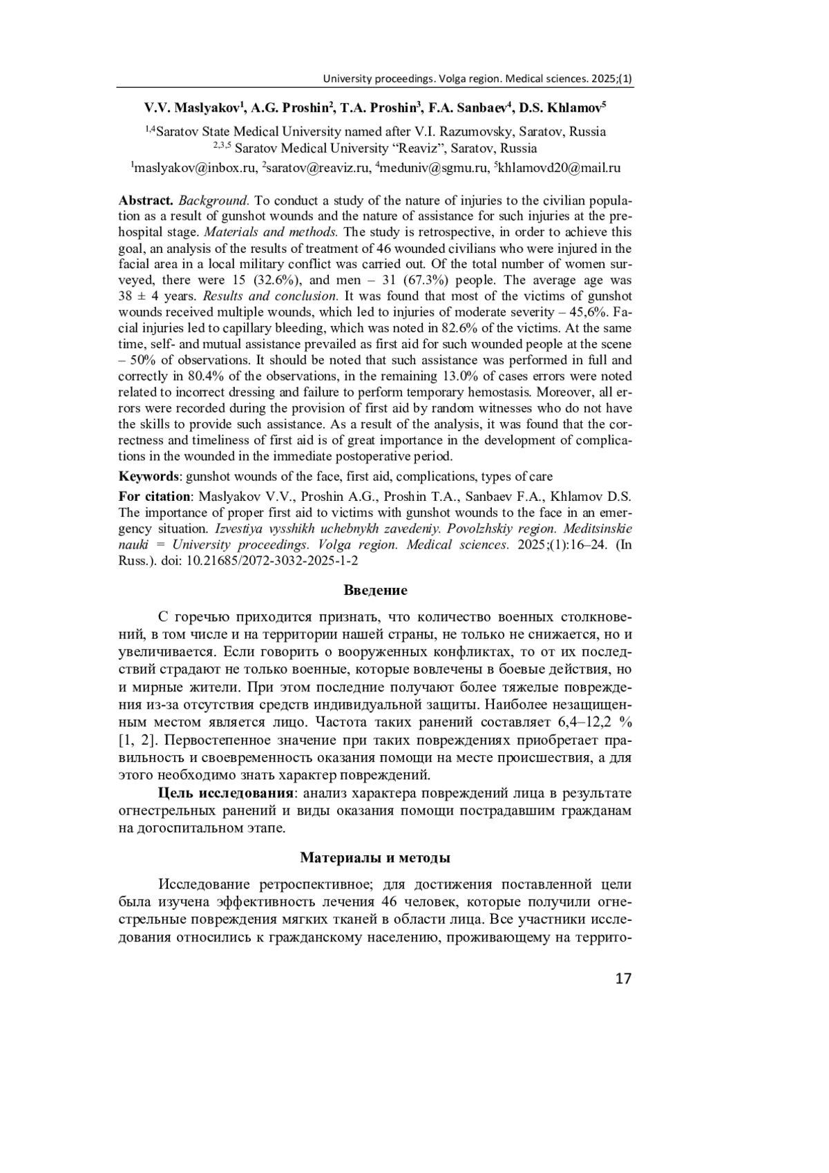 5. Швырков М. Б. Огнестрельные ранения лица и функциональные нарушения // Российский стоматологический журнал. 2017. Т. 20, № 3. С. 152-157. EDN: YURPAX