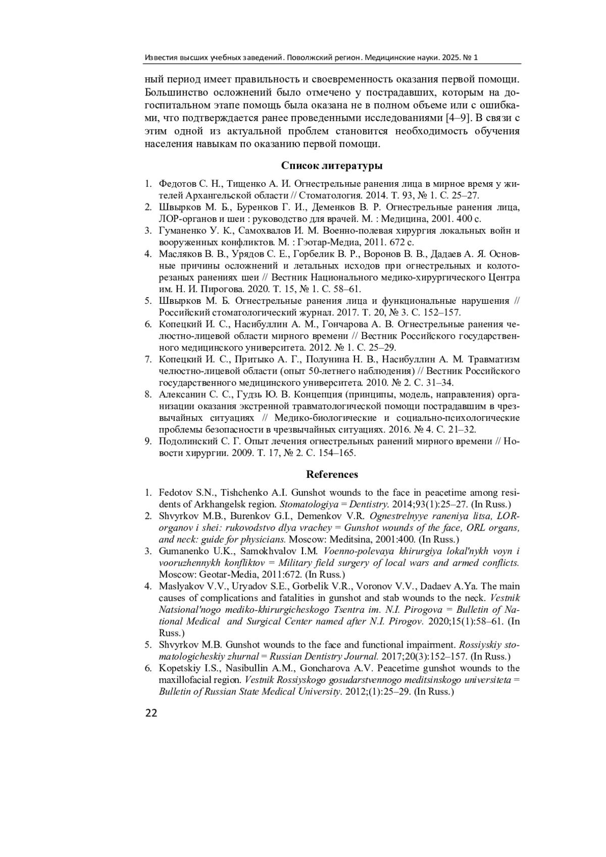 1. Федотов С. Н., Тищенко А. И. Огнестрельные ранения лица в мирное время у жителей Архангельской области // Стоматология. 2014. Т. 93, № 1. С. 25-27. EDN: RWIGBF