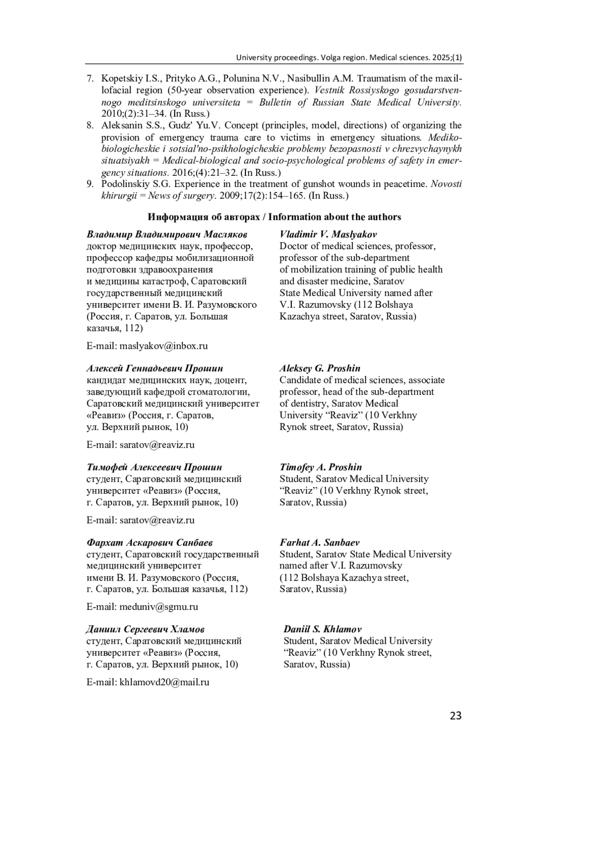 9. Подолинский С. Г. Опыт лечения огнестрельных ранений мирного времени // Новости хирургии. 2009. Т. 17, № 2. С. 154-165. EDN: PBYBHV