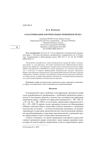 Отмечаются специфические черты доктринальных принципов права, осложняющие процесс их классификации. На основе позитивистского правопонимания предлагаются три авторские классификации доктринальных принципов российского права. Первая классификация основывается на таких критериях, как источник происхождения и источник, в котором сформулирован доктринальный принцип. Критерием второй классификации доктринальных принципов права является признание научным сообществом. В рамках третьей классификации доктринальные принципы выделяются в зависимости от сферы общественных отношений, на которую распространяется или может распространяться доктринальный принцип
