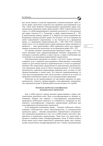 В юридической науке проблема классификации принципов права стала разрабатываться одновременно с проблемой принципов права в целом. К настоящему времени устоялись две основные классификации принципов права, а именно по сфере регулирования [1, c. 105—106; 12, с. 24—26; 19, с. 228—230] и по источнику закрепления принципов [4; 6; 20, с. 231—250]. В первом случае принципы делятся на общеправовые (общие), межотраслевые и отраслевые (иногда выделяют и принципы институтов), во втором — на конституционные принципы, не продублированные в отраслевом законодательстве, конституционные принципы, продублированные в отраслевом законодательстве, и принципы права, закрепленные только в отраслевом законодательстве.