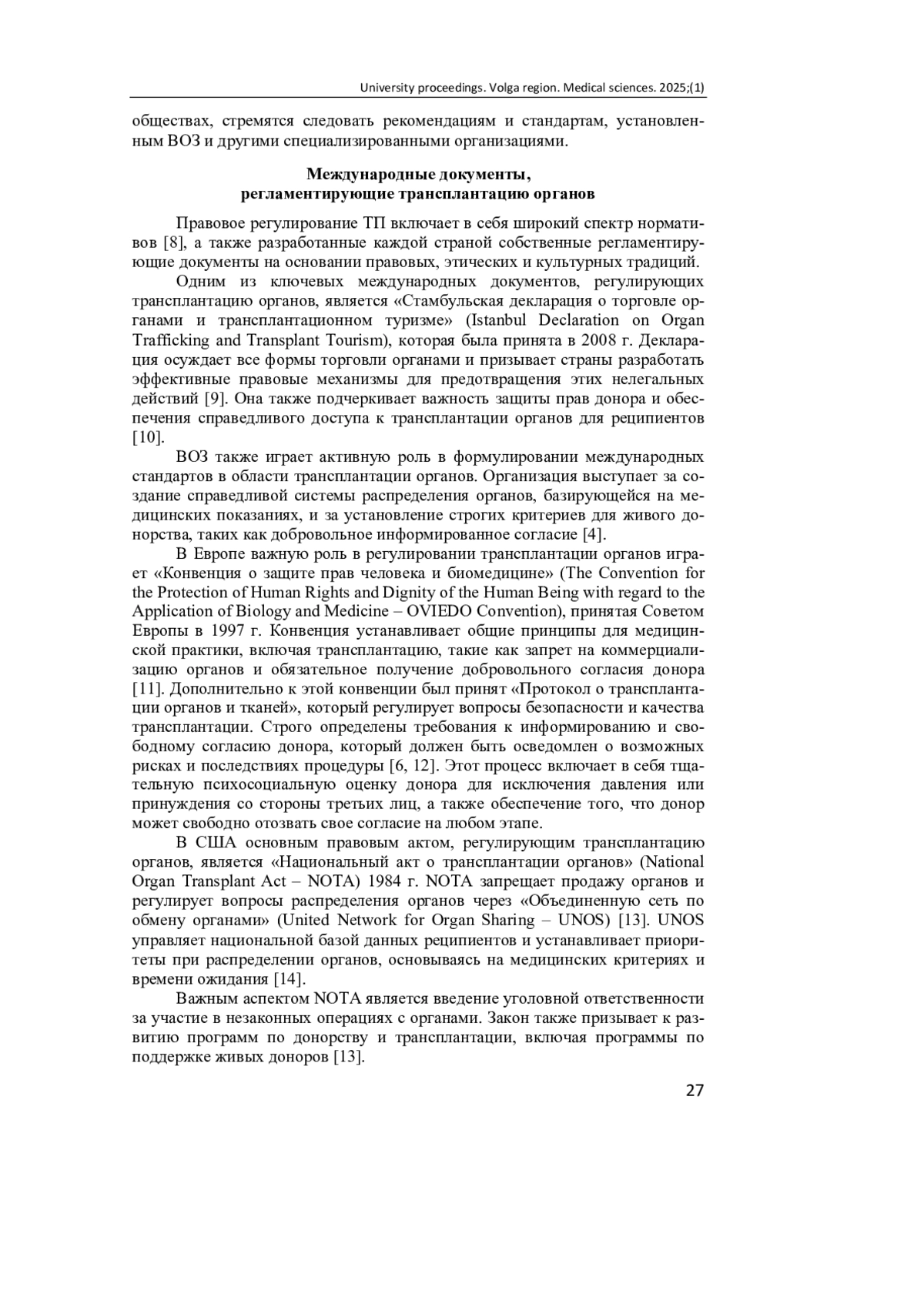 10. Ambagtsheer F., Annema C., Forsythe J., Jansen N., Paredes-Zapata D. Ethical and Legal Aspects of Organ Donation and Transplantation // Transplant International. 2024. Vol. 37 (13011). DOI: 10.3389/ti.2024.13011 EDN: XBRZEI