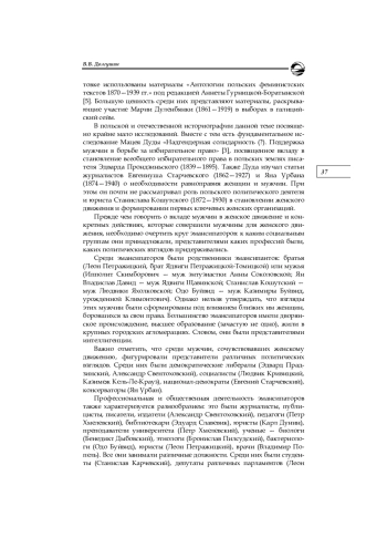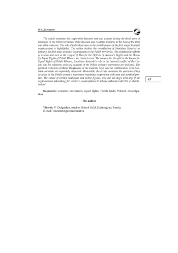 Рассматривается сотрудничество мужчин и женщин в рамках третьей волны феминизма в польских землях Российской и Австрийской империй на рубеже XIX— XX вв. Освещается роль отдельных мужчин в становлении первых крупных феминистских организаций. Раскрывается роль Станислава Кошутского в формировании первой массовой женской организации в польских землях. Характеризуется совместная деятельность женщин и мужчин в Лиге мужчин в защиту прав женщин и Союзе за равные права польских женщин. Проанализированы причины раскола Союза за равные права польских женщин, роль Станислава Кошутского во внутреннем конфликте Союза и его взаимоотношения с ключевыми активистками польского женского движения. Отдельно освещается политическое становление Марии Дуленбянки в галицийском сейме и ее сотрудничество с австрийскими социалистами. Рассматриваются позиции ключевых активисток польского женского движения по вопросу сотрудничества с мужчинами и с политическими партиями. Охарактеризована позиция отдельных политиков и общественных деятелей, не примыкавших ни к одной из организаций, выступавших за эмансипацию женщин для достижения национальных интересов