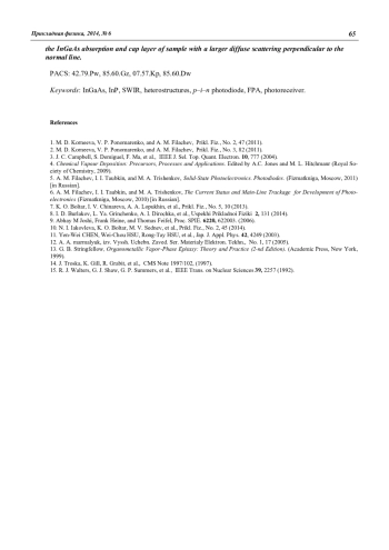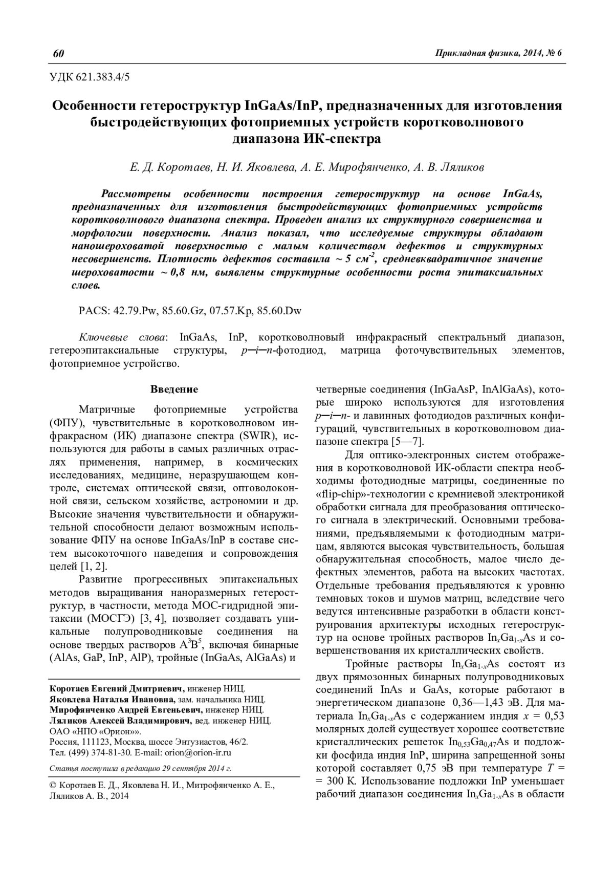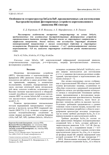 Коротаев Е. Д., Яковлева Н. И., Мирофянченко А. Е., Ляликов А. В. Особенности гетероструктур InGaAs/InP, предназначенных для изготовления быстродействующих фотоприемных устройств коротковолнового диапазона ИК-спектра 60
