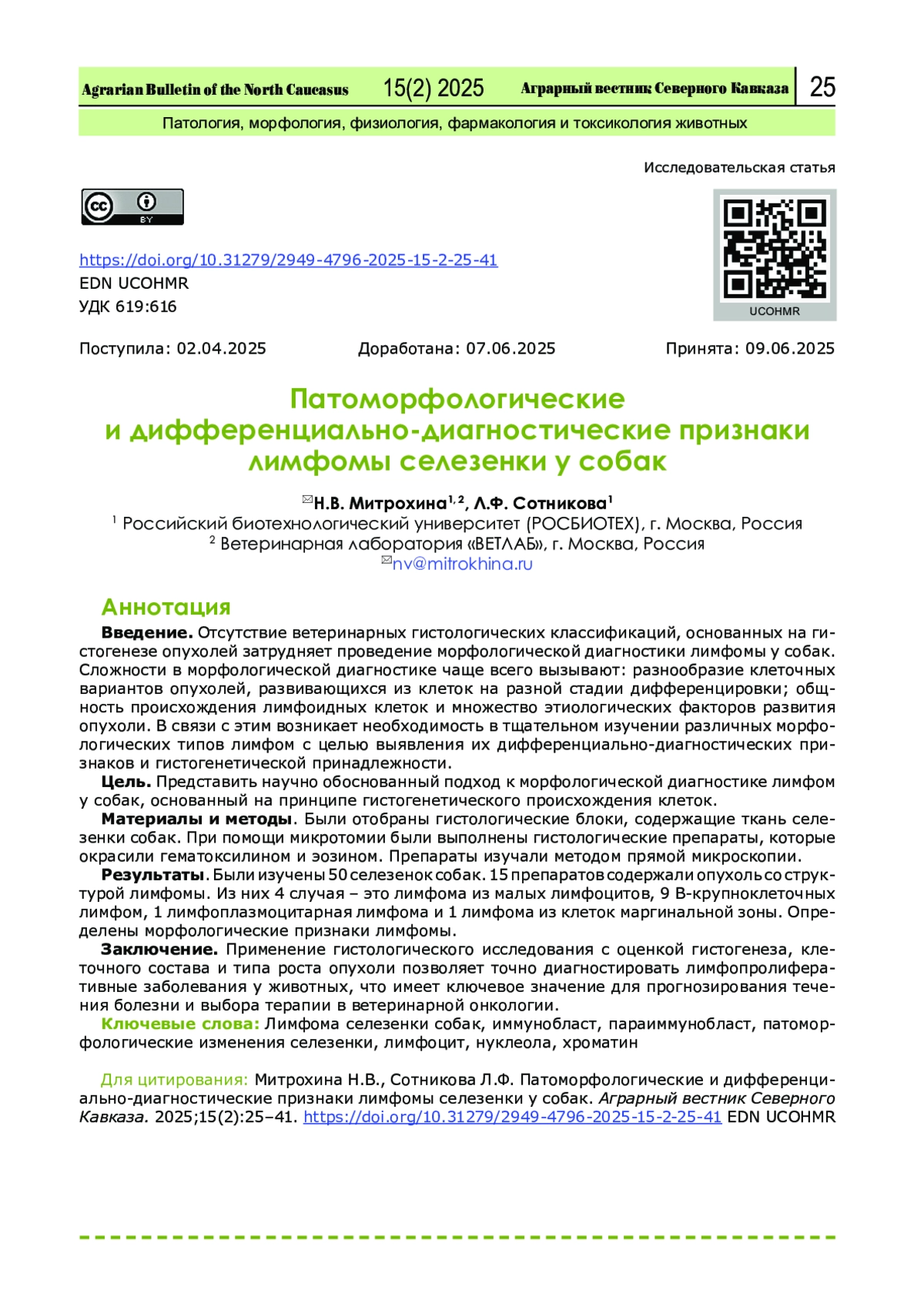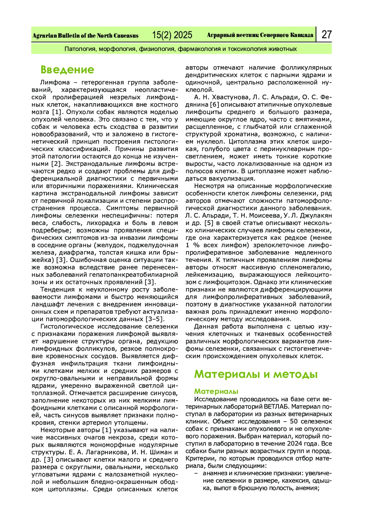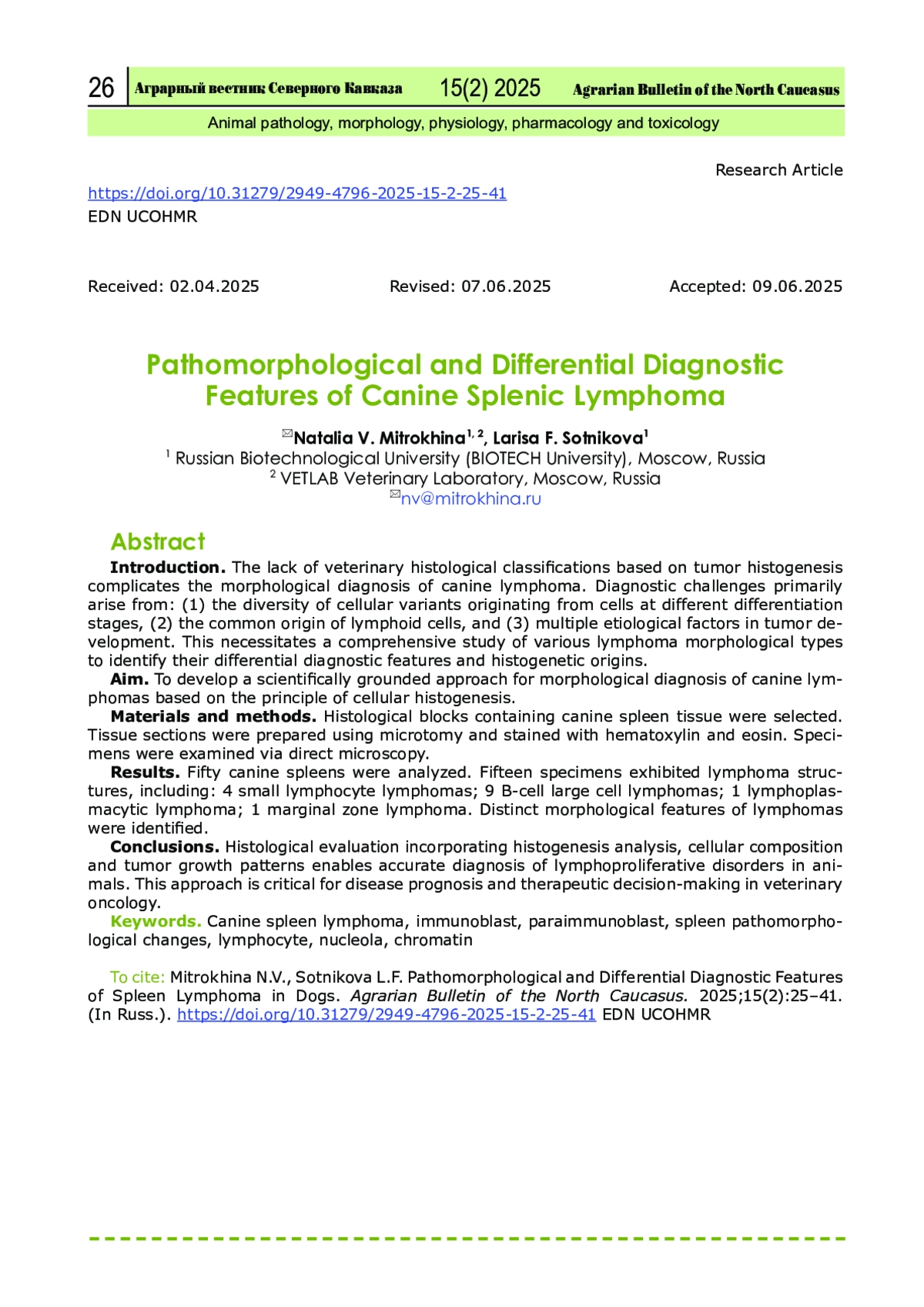 Введение. Отсутствие ветеринарных гистологических классификаций, основанных на гистогенезе опухолей затрудняет проведение морфологической диагностики лимфомы у собак. Сложности в морфологической диагностике чаще всего вызывают: разнообразие клеточных вариантов опухолей, развивающихся из клеток на разной стадии дифференцировки; общность происхождения лимфоидных клеток и множество этиологических факторов развития опухоли. В связи с этим возникает необходимость в тщательном изучении различных морфологических типов лимфом с целью выявления их дифференциально-диагностических признаков и гистогенетической принадлежности.