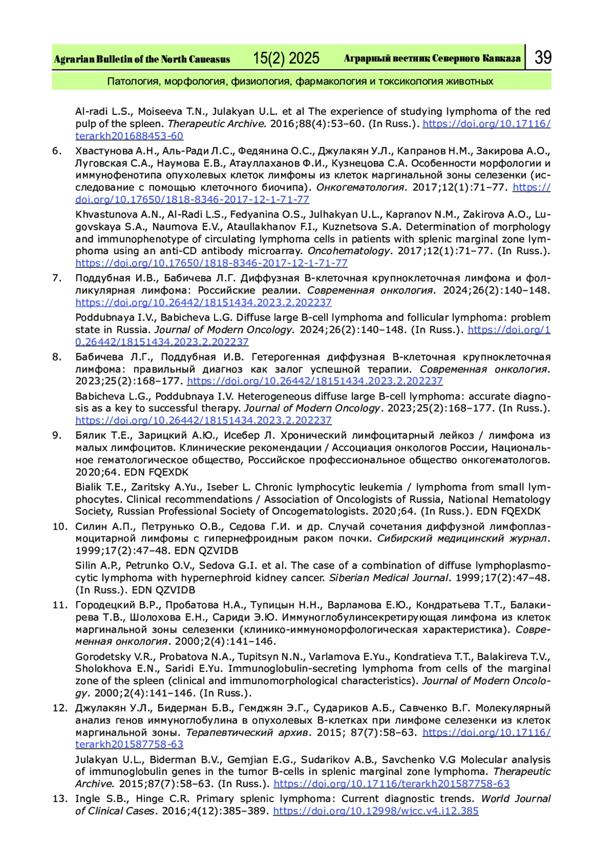 5. Аль-ради Л.С., Моисеева Т.Н., Джулакян У.Л., и др. Опыт изучения лимфомы красной пульпы селезенки. Терапевтический архив. 2016;88(4):53-60. DOI: 10.17116/terarkh201688453-60