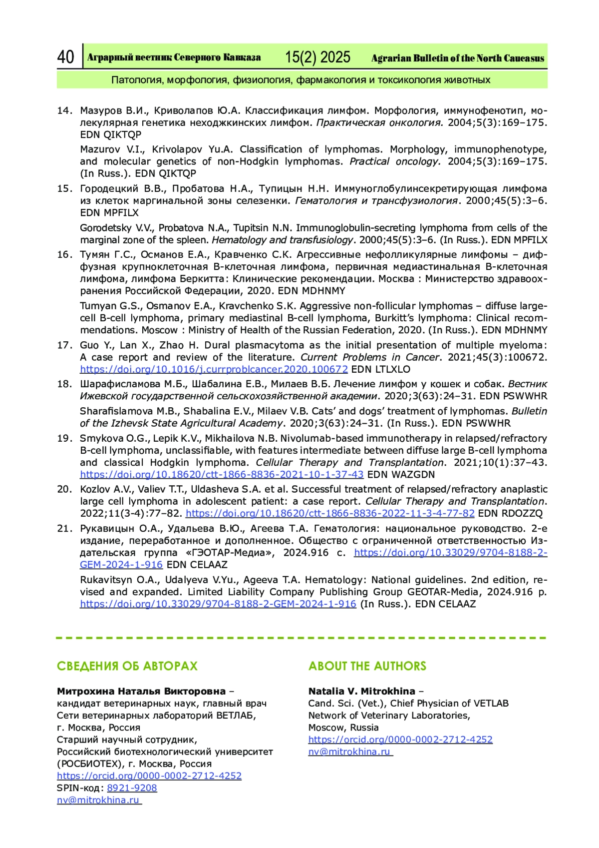 18. Шарафисламова М.Б., Шабалина Е.В., Милаев В.Б. Лечение лимфом у кошек и собак. Вестник Ижевской государственной сельскохозяйственной академии. 2020;3(63):24-31.