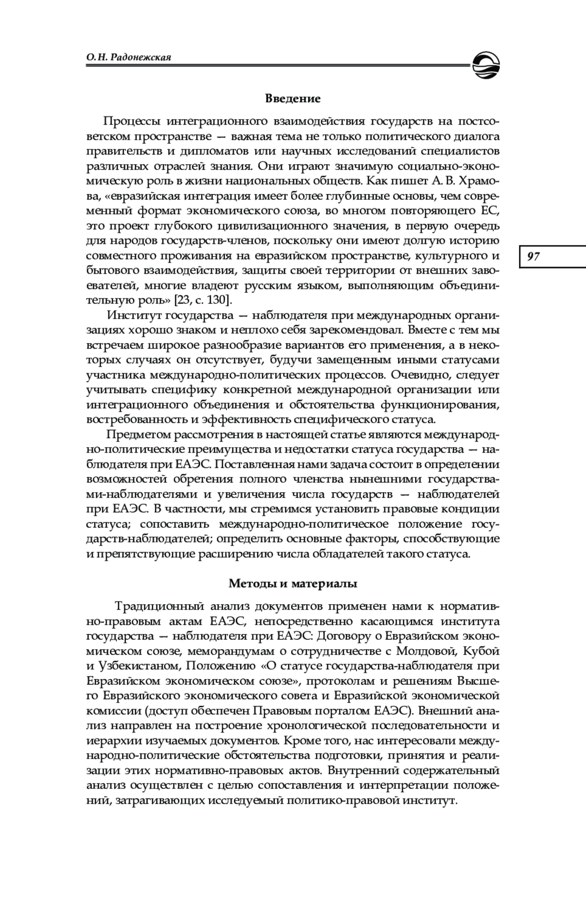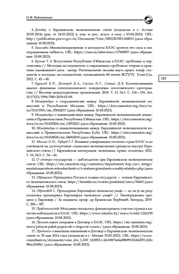 20. Серегина А. А., Богомолова В. Е., Харланов А. С. Роль статуса страны в ЕАЭС // Евразийская интеграция: экономика, право, политика. 2021. Т. 15, № 3. С. 125- 134. EDN: IJKTUR