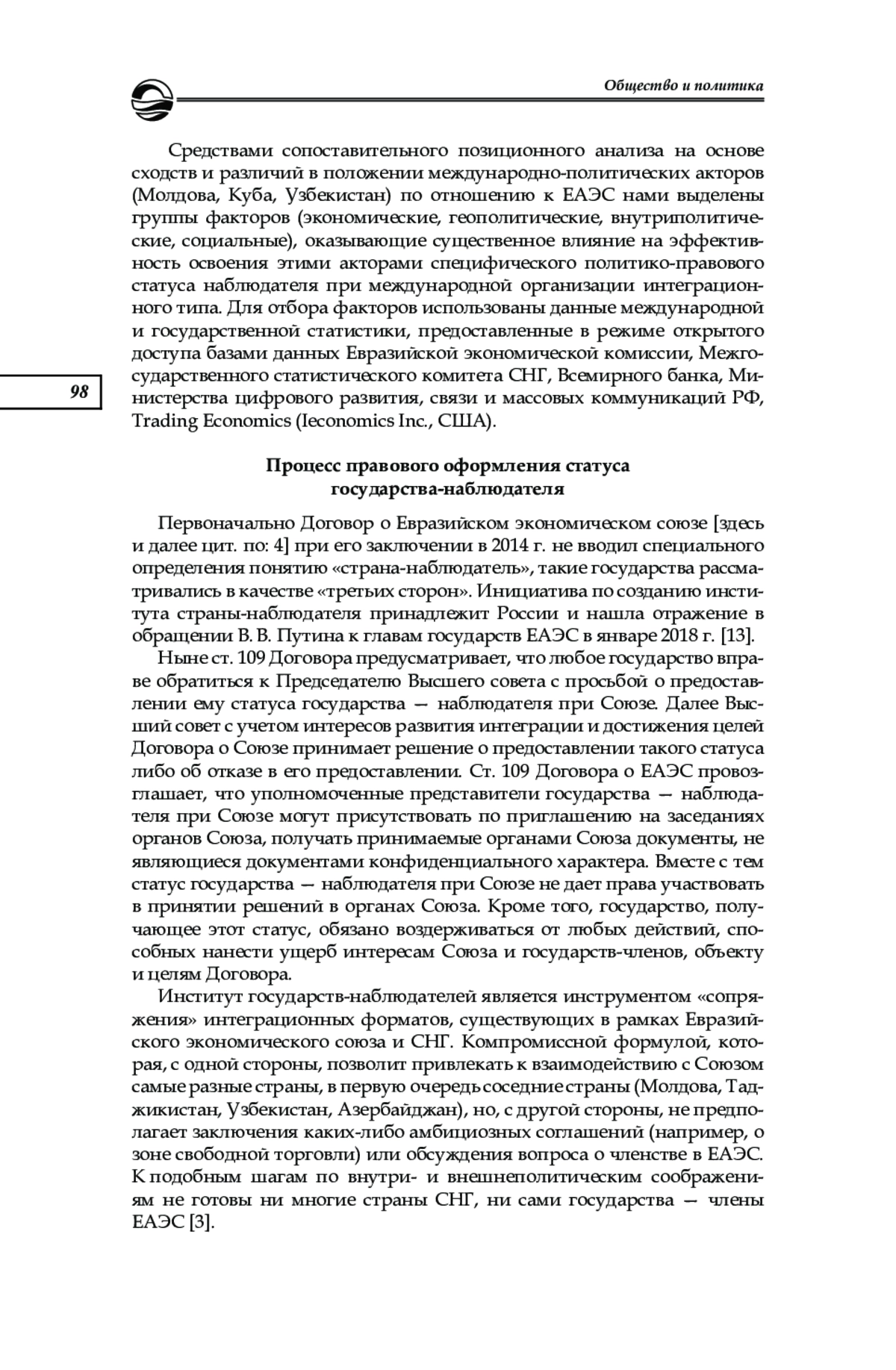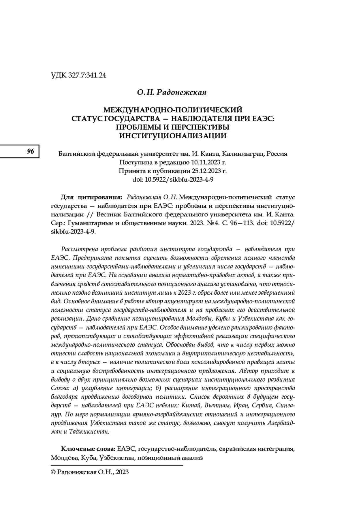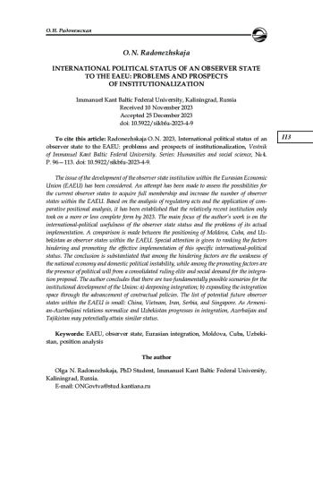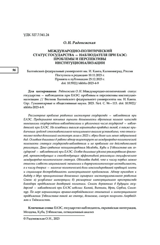 Рассмотрена проблема развития института государства — наблюдателя при ЕАЭС. Предпринята попытка оценить возможности обретения полного членства нынешними государствами-наблюдателями и увеличения числа государств — наблюдателей при ЕАЭС. На основании анализа нормативно- правовых актов, а также привлечения средств сопоставительного позиционного анализа установлено, что относительно поздно возникший институт лишь к 2023 г. обрел более или менее завершенный вид. Основное внимание в работе автор акцентирует на международно- политической полезности статуса государства-наблюдателя и на проблемах его действительной реализации. Дано сравнение позиционирования Молдовы, Кубы и Узбекистана как государств — наблюдателей при ЕАЭС. Особое внимание уделено ранжированию факторов, препятствующих и способствующих эффективной реализации специфического международно-политического статуса. Обоснован вывод, что к числу первых можно отнести слабость национальной экономики и внутриполитическую нестабильность, а к числу вторых — наличие политической воли консолидированной правящей элиты и социальную востребованность интеграционного предложения. Автор приходит к выводу о двух принципиально возможных сценариях институционального развития Союза: а) углубление интеграции; б) расширение интеграционного пространства благодаря продвижению договорной политики. Список вероятных в будущем государств — наблюдателей при ЕАЭС невелик: Китай, Вьетнам, Иран, Сербия, Сингапур. По мере нормализации армяно- азербайджанских отношений и интеграционного продвижения Узбекистана такой же статус, возможно, смогут получить Азербайджан и Таджикистан