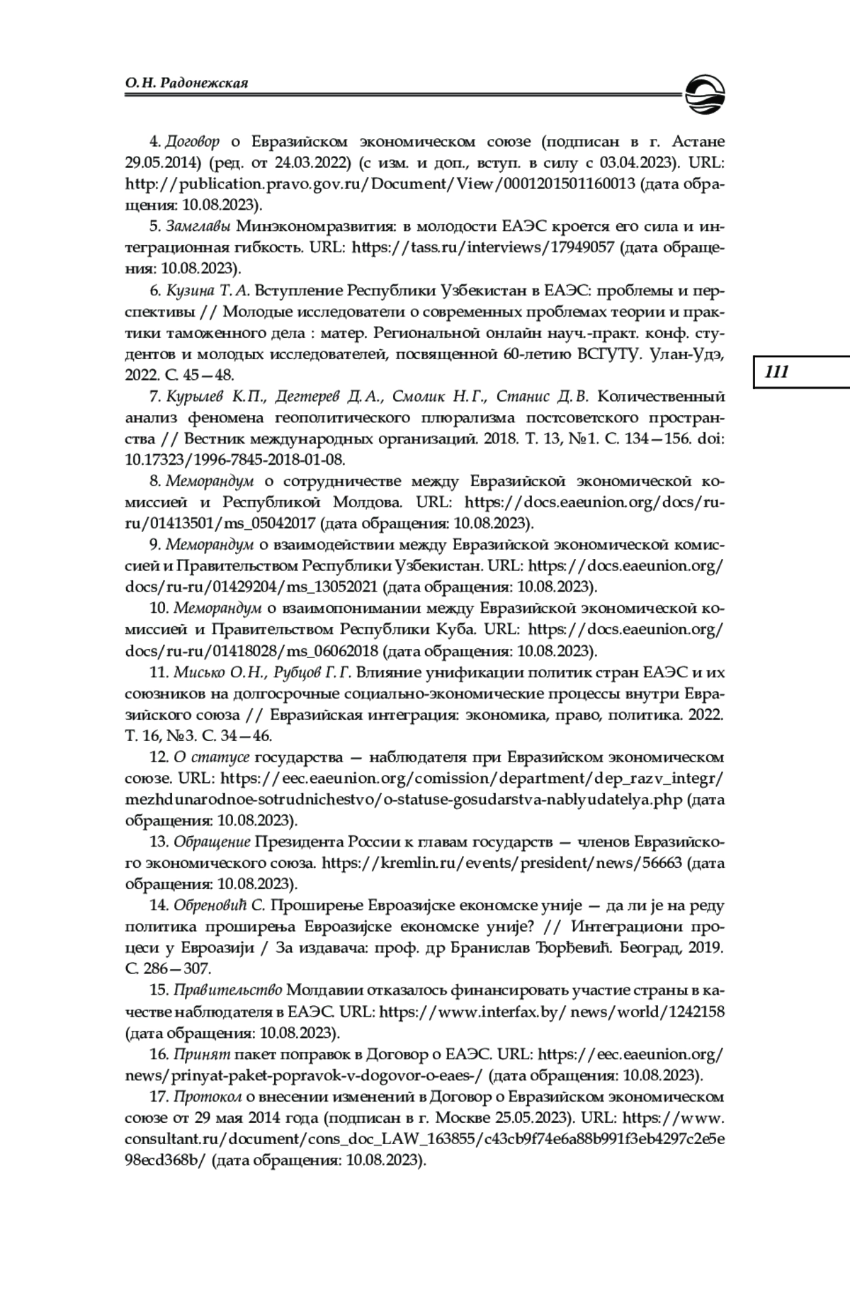 14. Обреновић С. Проширење Евроазијске економске уније - да ли је на реду политика проширења Евроазијске економске уније? // Интеграциони процеси у Евроазији / За издавача: проф. др. Бранислав Ђорђевић. Београд, 2019. С. 286- 307.