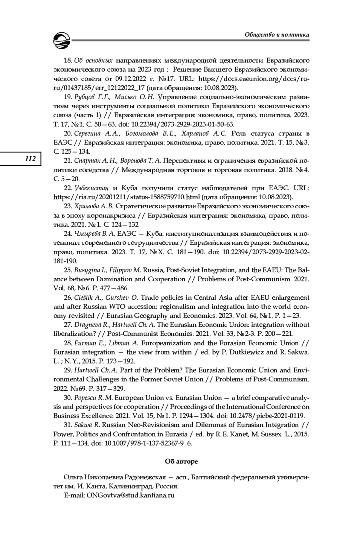 26. Cieślik A., Gurshev O. Trade policies in Central Asia after EAEU enlargement and after Russian WTO accession: regionalism and integration into the world economy revisited // Eurasian Geography and Economics. 2023. Vol. 64, № 1. P. 1-23.