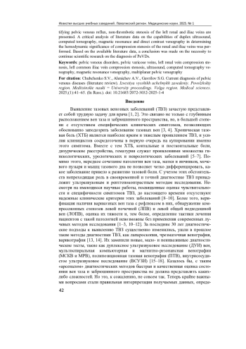 46. Calcagno T., Sulakvelidze L., Kennedy R. [et al.]. Transabdominal ultrasound accurately identifies a significant iliac vein area-reducing lesion in patients with pelvic venous insufficiency // J Vasc Surg Venous Lymphat Disord. 2023. Vol. 11 (6). P. 1213-1218. DOI: 10.1016/j.jvsv.2023.06.011
