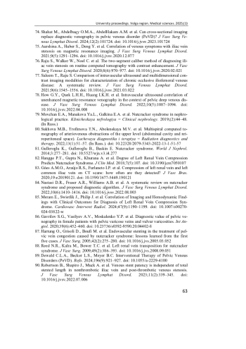 85. Meram E., Swietlik J., Philip J. [et al.]. Correlation of Imaging and Hemodynamic Findings with Clinical Outcomes for Diagnosis of Left Renal Vein Compression Syndrome // Cardiovasc Intervent Radiol. 2024. Vol. 47 (9). P. 1190-1199. DOI: 10.1007/s00270-024-03822-w