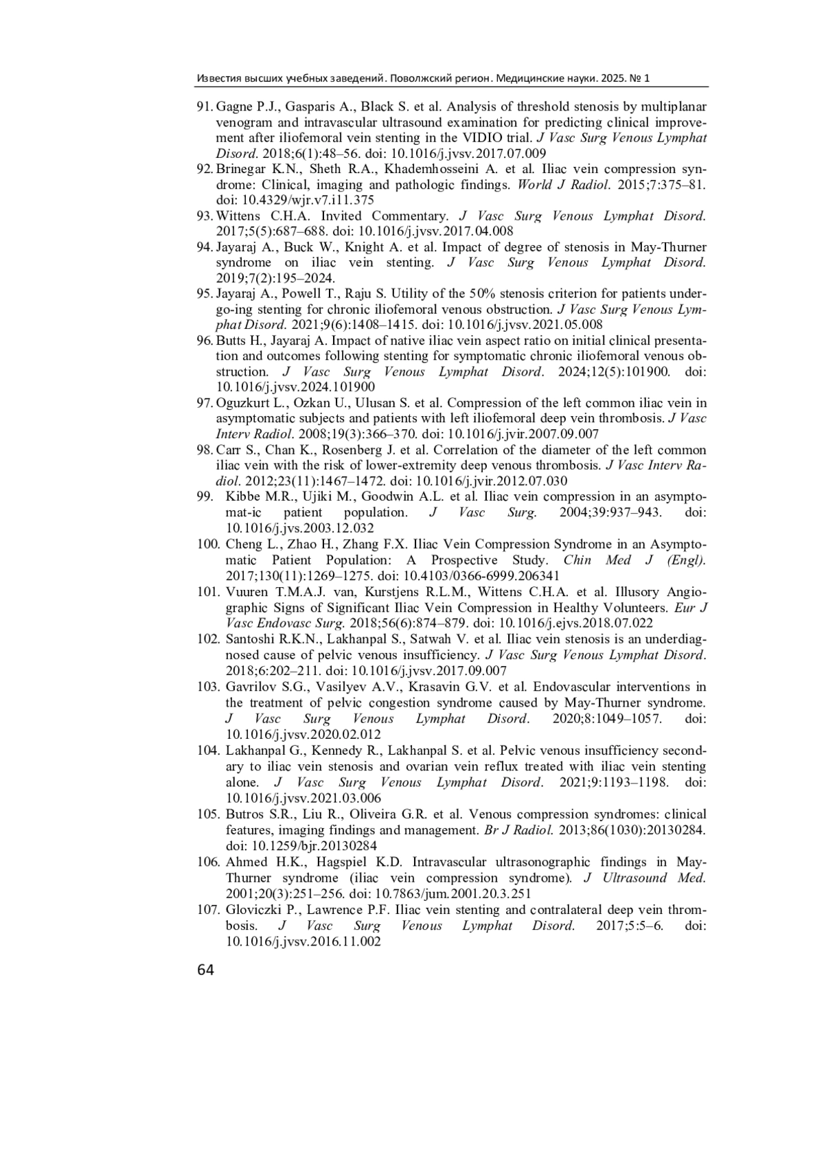94. Jayaraj A., Buck W., Knight A. [et al.]. Impact of degree of stenosis in May-Thurner syndrome on iliac vein stenting // J Vasc Surg Venous Lymphat Disord. 2019. Vol. 7 (2). P. 195-2024.