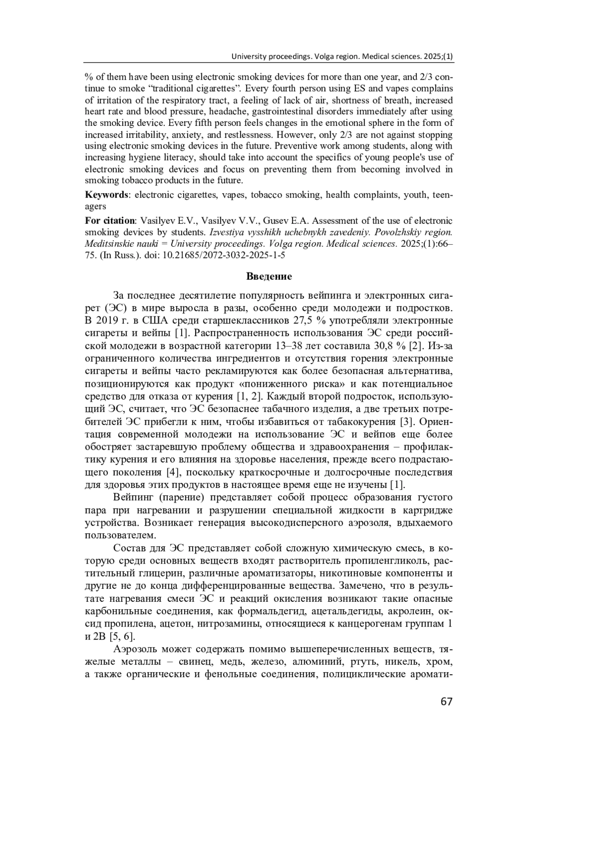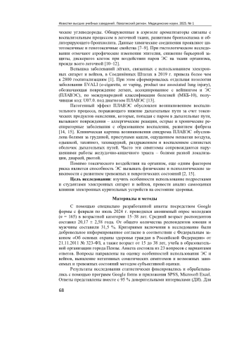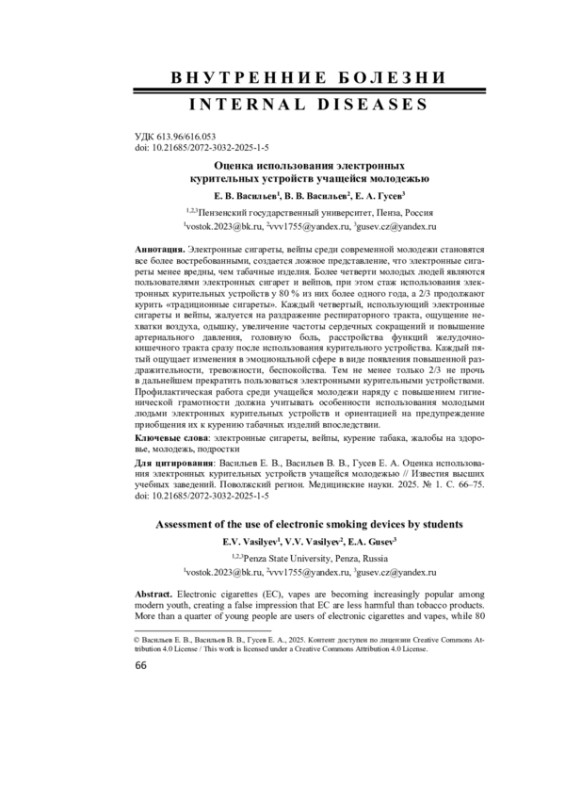 Электронные сигареты, вейпы среди современной молодежи становятся все более востребованными, создается ложное представление, что электронные сигареты менее вредны, чем табачные изделия. Более четверти молодых людей являются пользователями электронных сигарет и вейпов, при этом стаж использования электронных курительных устройств у 80 % из них более одного года, а 2/3 продолжают курить «традиционные сигареты». Каждый четвертый, использующий электронные сигареты и вейпы, жалуется на раздражение респираторного тракта, ощущение нехватки воздуха, одышку, увеличение частоты сердечных сокращений и повышение артериального давления, головную боль, расстройства функций желудочно-кишечного тракта сразу после использования курительного устройства. Каждый пятый ощущает изменения в эмоциональной сфере в виде появления повышенной раздражительности, тревожности, беспокойства. Тем не менее только 2/3 не прочь в дальнейшем прекратить пользоваться электронными курительными устройствами. Профилактическая работа среди учащейся молодежи наряду с повышением гигиенической грамотности должна учитывать особенности использования молодыми людьми электронных курительных устройств и ориентацией на предупреждение приобщения их к курению табачных изделий впоследствии.