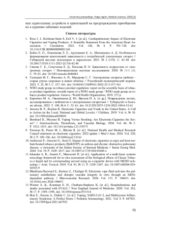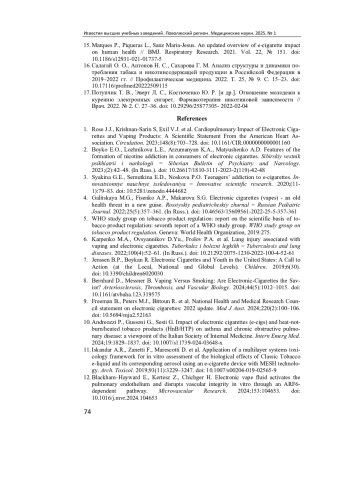 1. Rose J. J., Krishnan-Sarin S, Exil V. J. [et al.]. Cardiopulmonary Impact of Electronic Cigarettes and Vaping Products: A Scientific Statement From the American Heart Association // Circulation. 2023. Vol. 148, № 8. P. 703-728. DOI: 10.1161/CIR.0000000000001160 EDN: UCIHAU