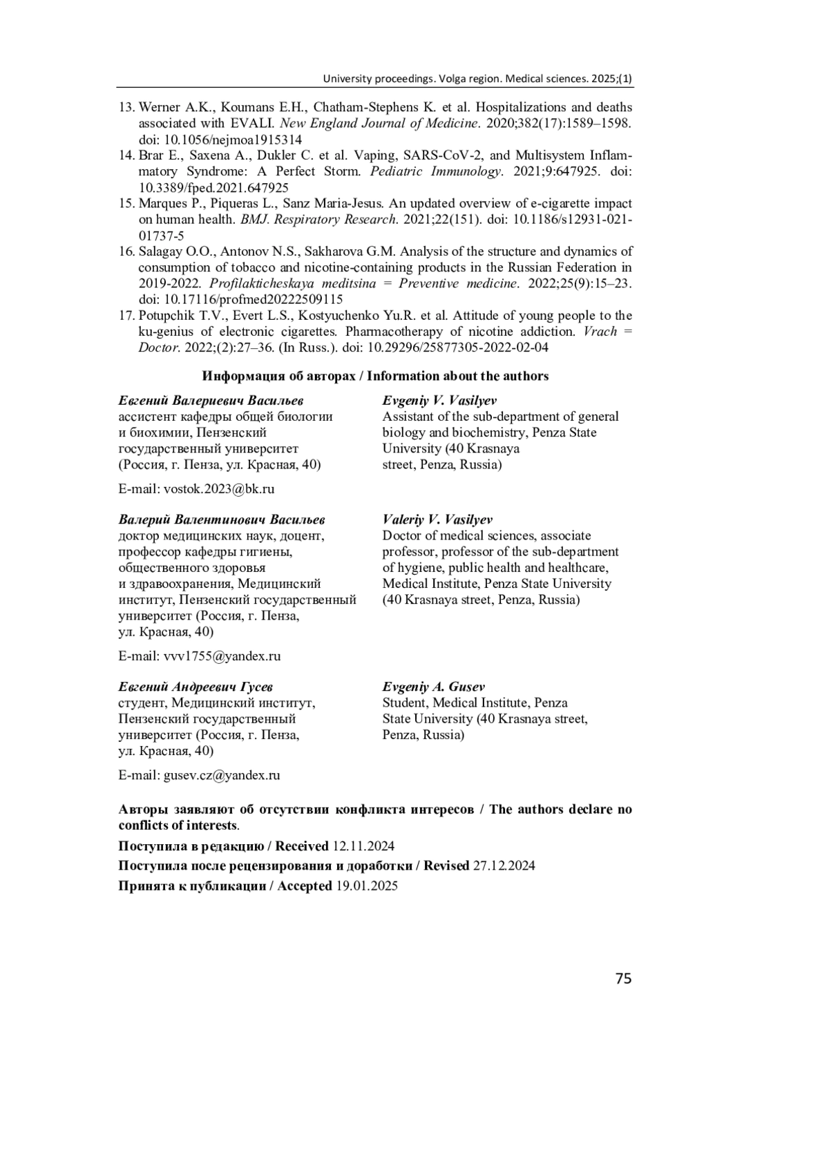 6. Карпенко М. А., Овсянников Д. Ю., Фролов П. А. [и др.]. Повреждение легких, ассоциированное с вейпингом и электронными сигаретами // Туберкулёз и болезни лёгких. 2022. Т. 100, № 4. С. 52-61. DOI: 10.21292/2075-1230-2022-100-4-52-61 EDN: RGVNNZ