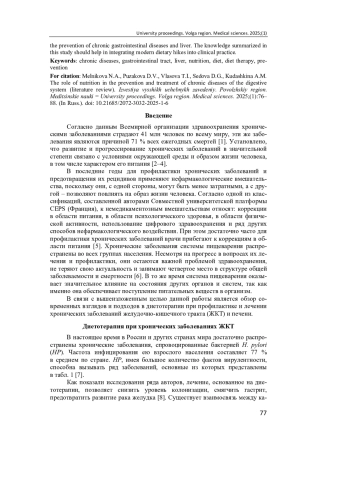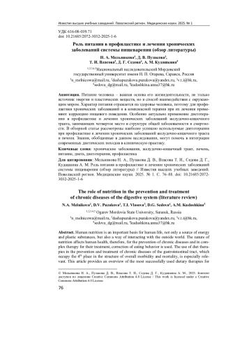 Питание человека - важная основа его жизнедеятельности, не только источник энергии и пластических веществ, но и способ взаимодействия с окружающим миром. Характер питания отражается на здоровье человека, поэтому для профилактики хронических заболеваний и в комплексной терапии при их лечении применяют коррекцию пищевого поведения. Особенно актуально применение диетотерапии в профилактике и лечении хронических заболеваний желудочно-кишечного тракта, занимающих четвертое место в структуре общей заболеваемости и смертности. В обзорной статье рассмотрены наиболее успешно используемые диетотерапии при профилактике и лечении хронических заболеваний желудочно-кишечного тракта и печени. Знания, обобщенные в данном исследовании, могут помочь в интеграции современных диетических походов в клиническую практику.