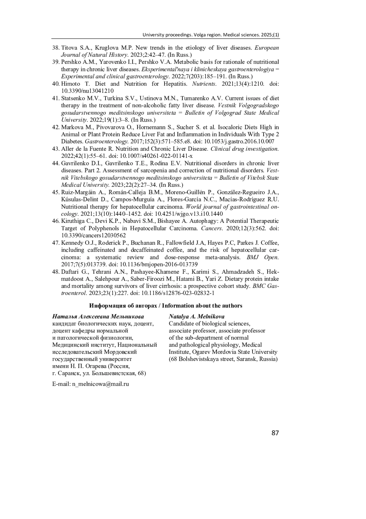 39. Першко А. М., Яровенко И. И., Першко В. А. Метаболические основы обоснования терапии питанием при хронических заболеваниях печени // Экспериментальная и клиническая гастроэнтерология. 2022. Т. 7, № 203. С. 185-191. EDN: PQSQZZ