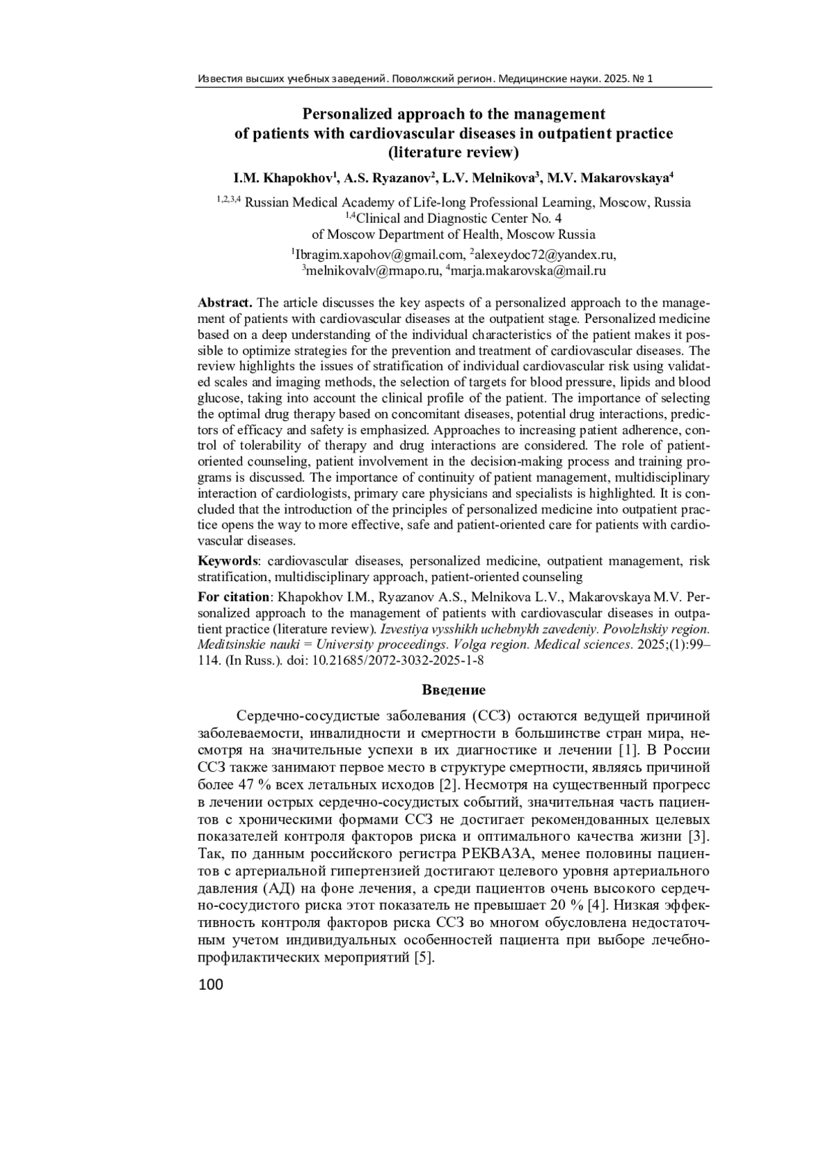 Сердечно-сосудистые заболевания (ССЗ) остаются ведущей причиной заболеваемости, инвалидности и смертности в большинстве стран мира, несмотря на значительные успехи в их диагностике и лечении [1]. В России ССЗ также занимают первое место в структуре смертности, являясь причиной более 47 % всех летальных исходов [2].