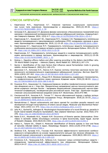 4. Квартникова Е.Г., Квартников М.П. Переваримость питательных веществ полнорационного комбикорма крольчихами в первую четверть сукрольности. Ветеринария Кубани. 2021;(5): 33-35. https://doi. DOI: 10.33861/2071-8020-2021-5-33-35